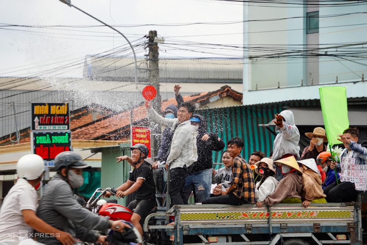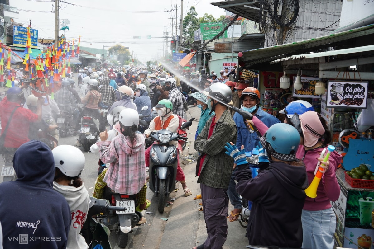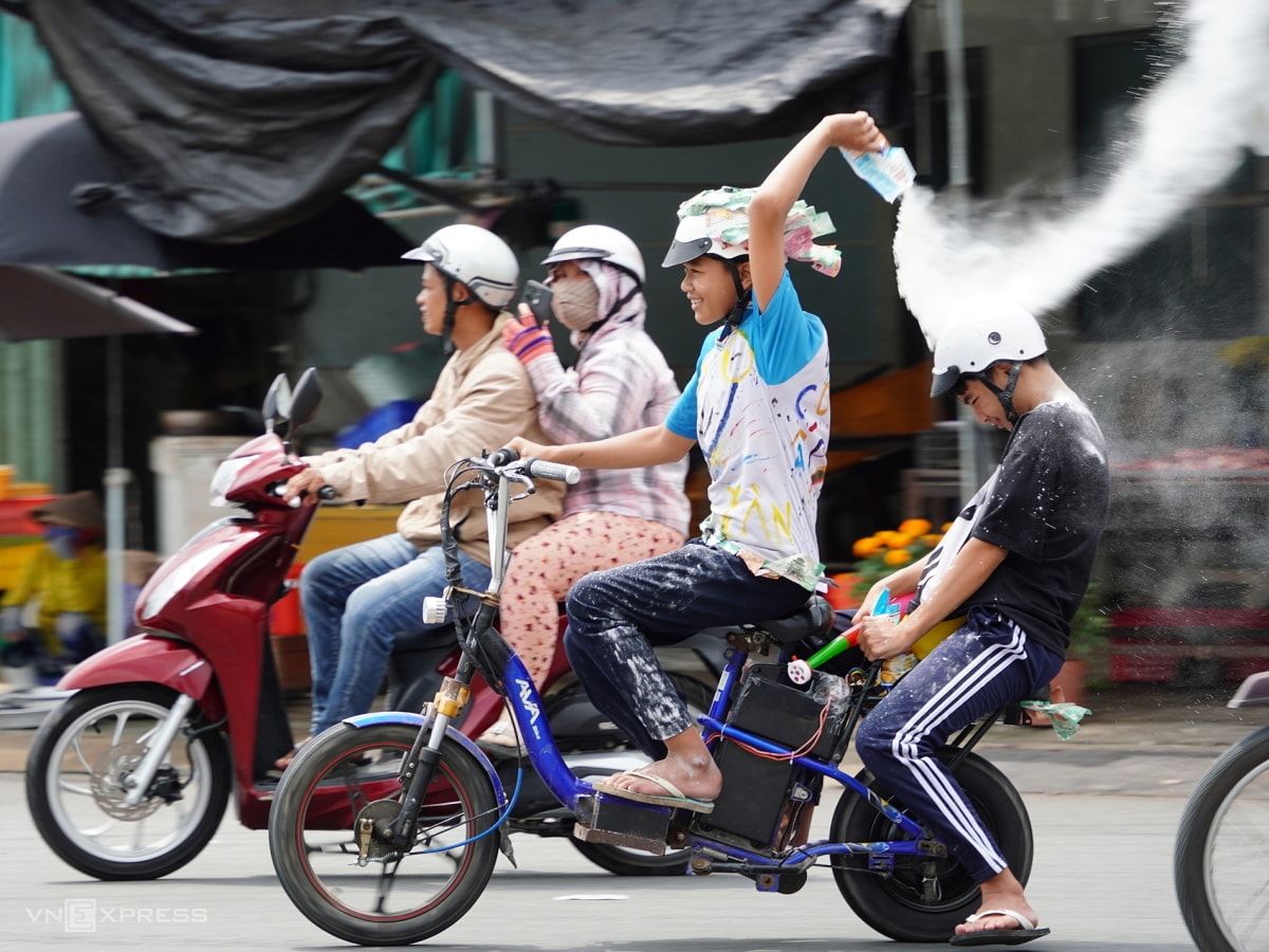 Từ 10h, người dân hai bên đường dùng xô, ca nhựa, thậm chí vòi rửa xe xịt nước người đi đường mừng lễ. Ngoài xe máy, nhiều ôtô, xe tải, xe ba gác cũng tham gia diễu hành.