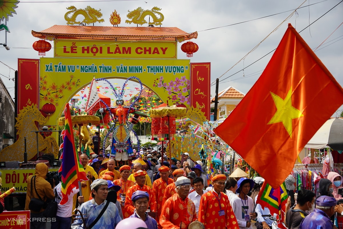 Hàng nghìn người hóa trang thành "yêu quái" hoặc các nhân vật kinh dị xuống đường phun lửa, ném bột mì ăn mừng ngày lễ hội Làm Chay.
