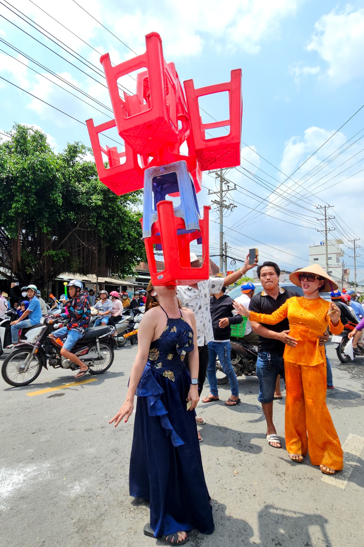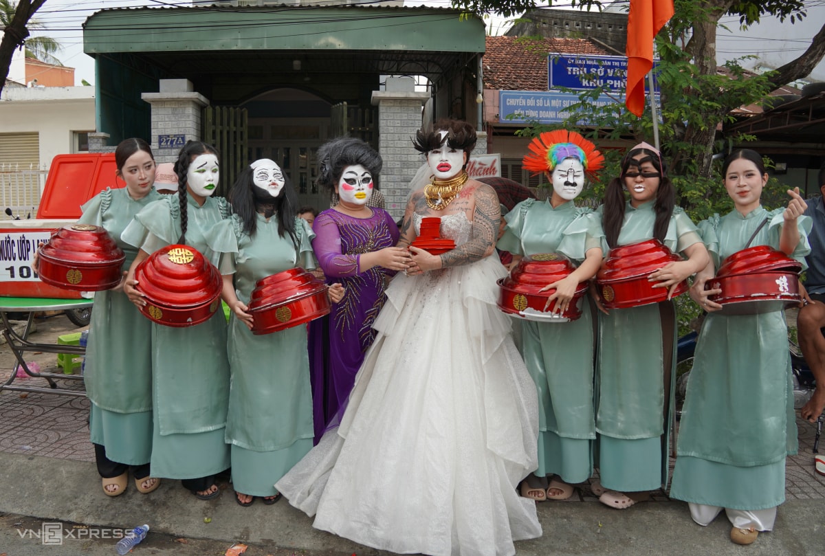 Nhóm phụ nữ hóa trang thành đoàn bưng mâm quả đưa dâu phong cách kinh dị bên đường.