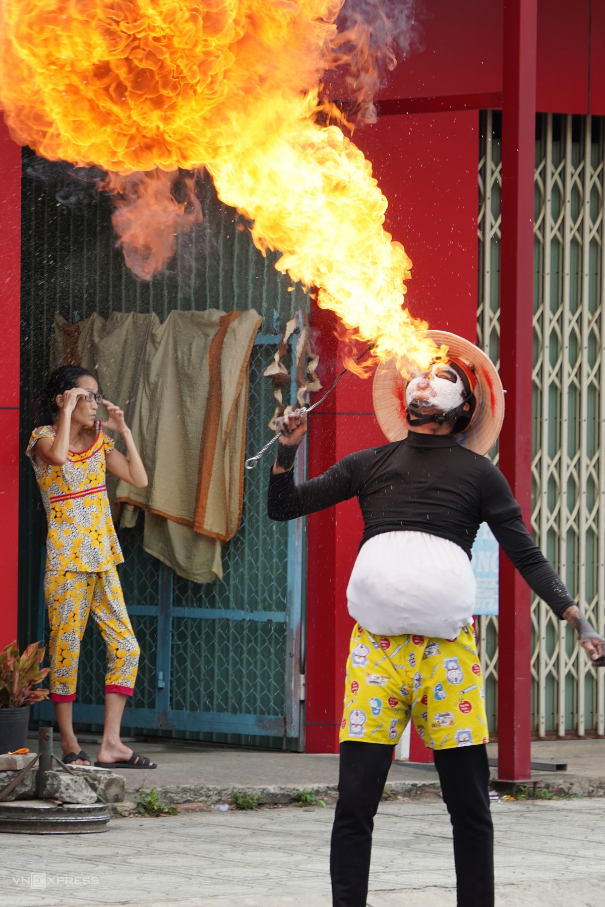 Hoá trang 'yêu quái' phun lửa, ném bột mì ở lễ hội Làm Chay