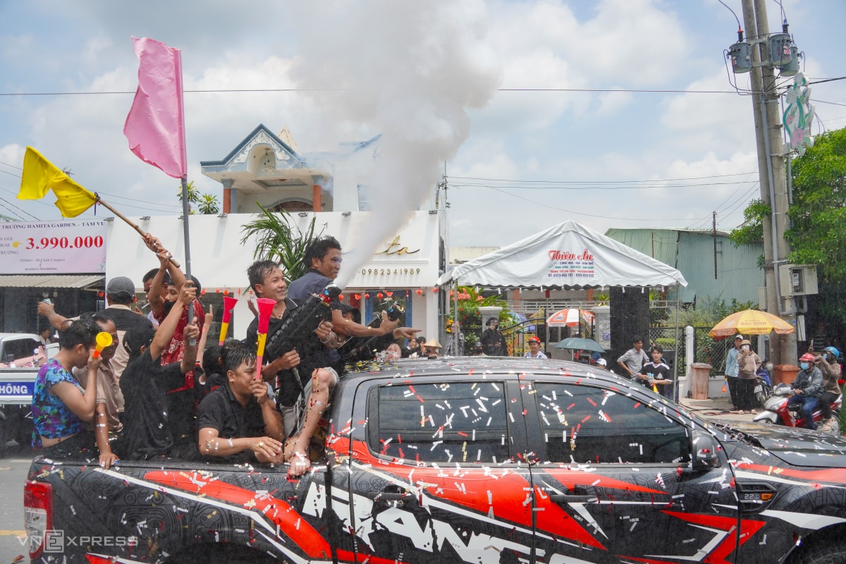 Một nhóm thanh niên đi xe bán tải mang theo súng phun khói tham gia diễu hành.