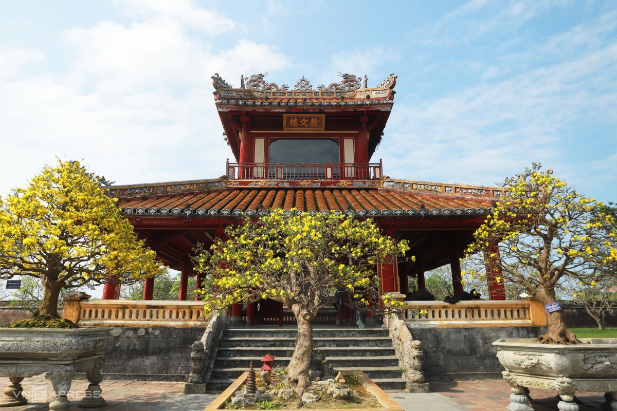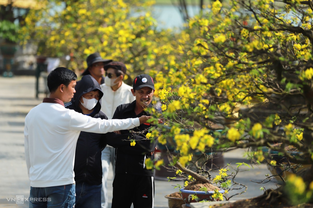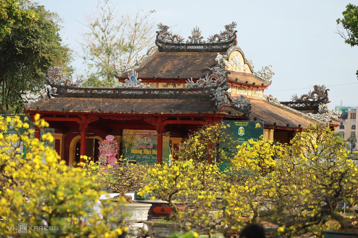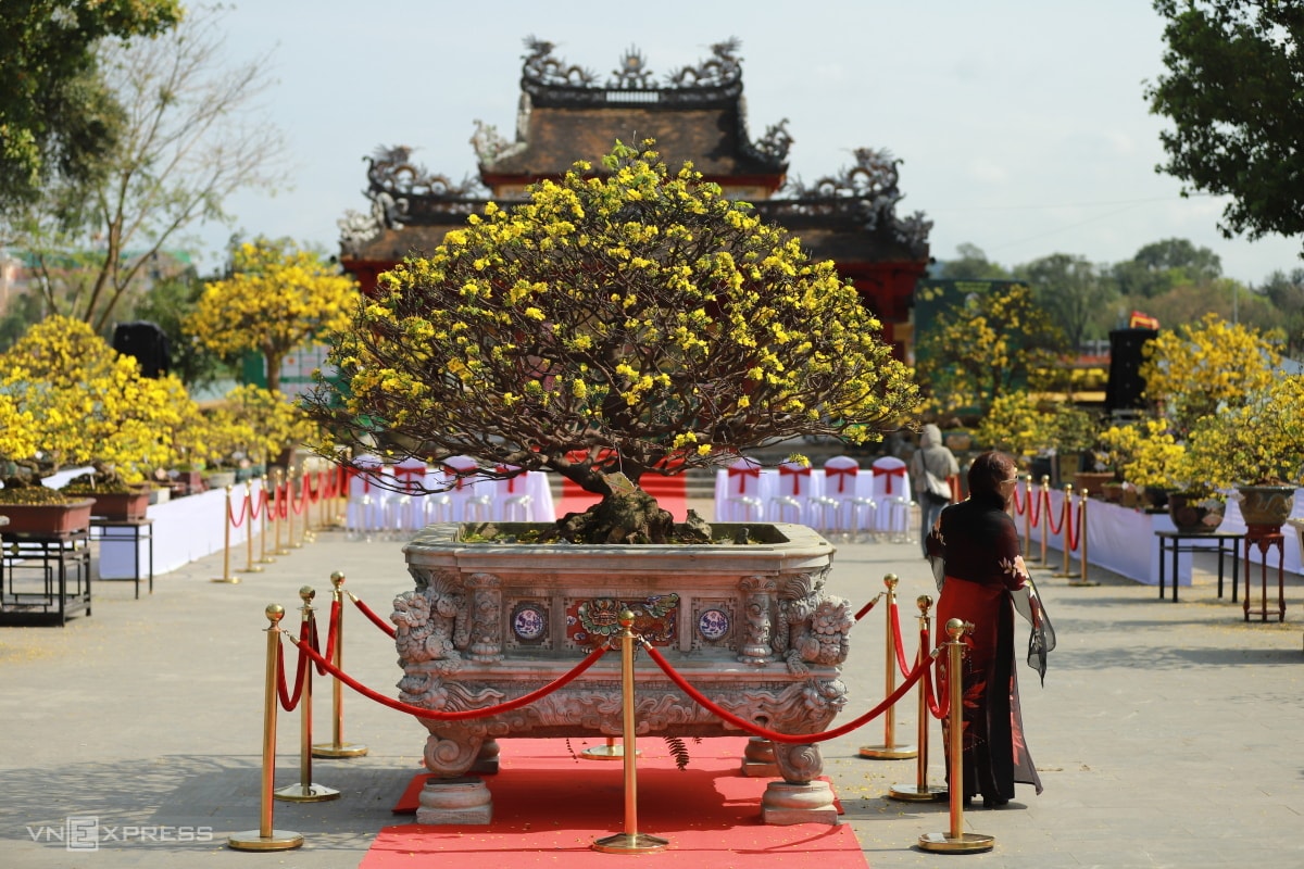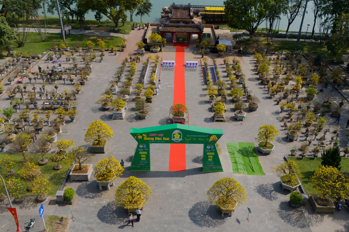 Hơn 500 gốc Hoàng mai cổ thụ được trưng bày tại khu vực di tích Nghênh Lương Đình, Phu Văn Lâu, nhiều cây được định giá hai hoặc ba tỷ đồng.