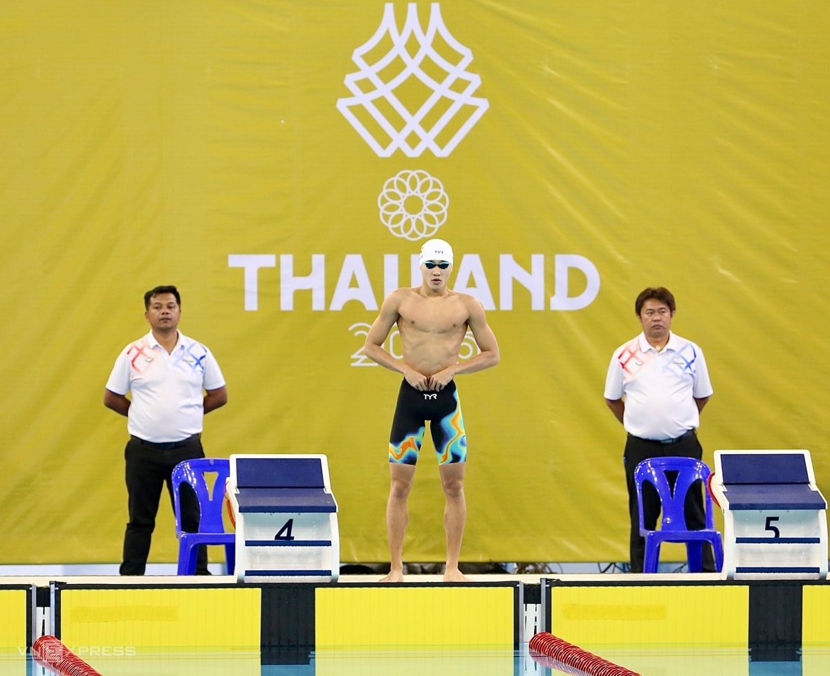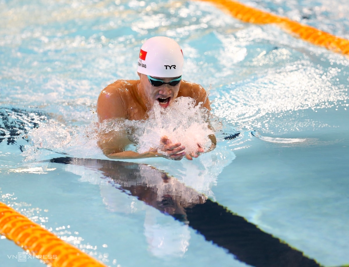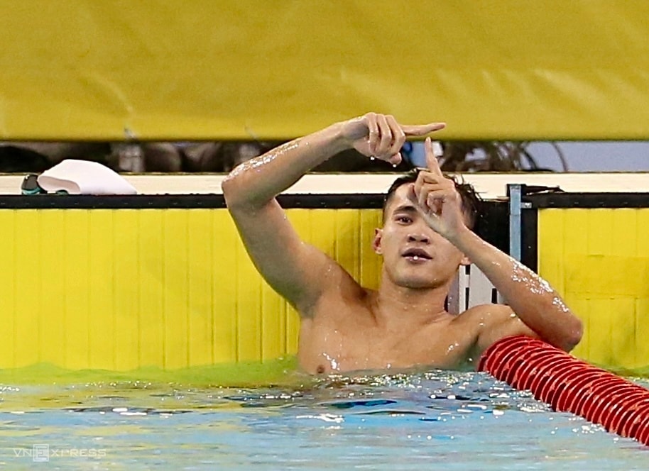 Phạm Thanh Bảo tạo hình chữ "T" để thể hiện tên bạn gái Võ Thị Mỹ Tiên, sau khi về nhất bơi ếch 200m nam tại SEA Games 33.