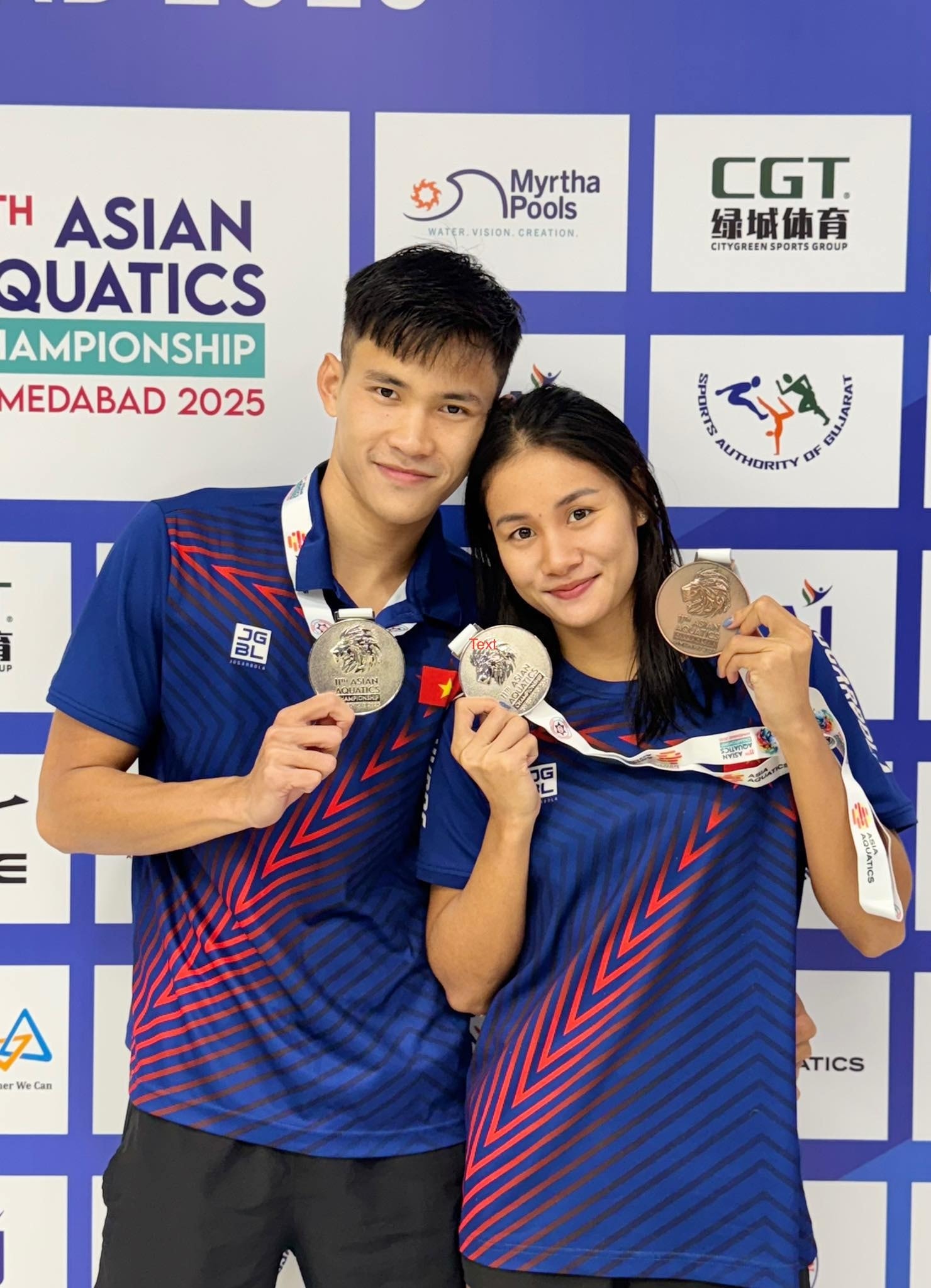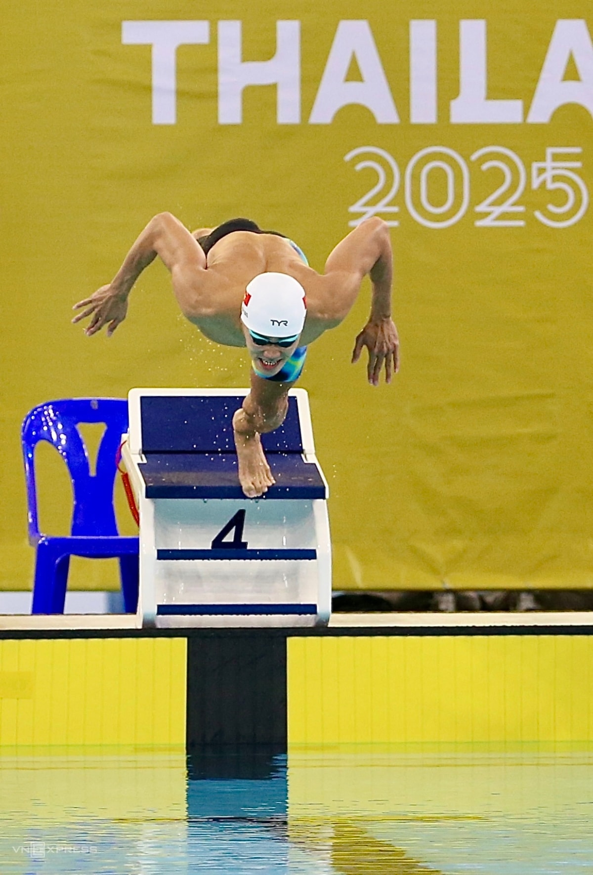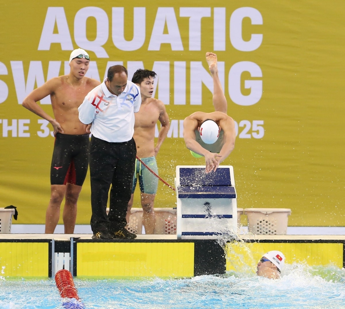 Phạm Thanh Bảo tạo hình chữ "T" để thể hiện tên bạn gái Võ Thị Mỹ Tiên, sau khi về nhất bơi ếch 200m nam tại SEA Games 33.