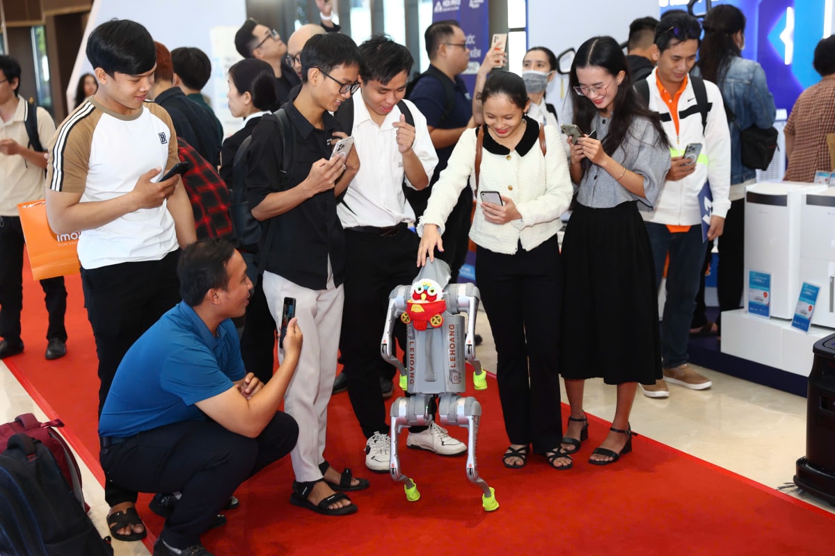 Một nhóm trải nghiệm chó robot của Unitree Go2 Pro, do Lê Hoàng Robotics phân phối. Hoài Nam, sinh viên trường Đại học Bách khoa TP HCM, cho biết đang học chuyên ngành về robot và AI. "Bên cạnh trải nghiệm các mẫu robot, tôi còn được các hãng giải thích chi tiết về kỹ thuật, giúp có thêm kiến thức bổ ích bên ngoài giảng đường", Nam chia sẻ.