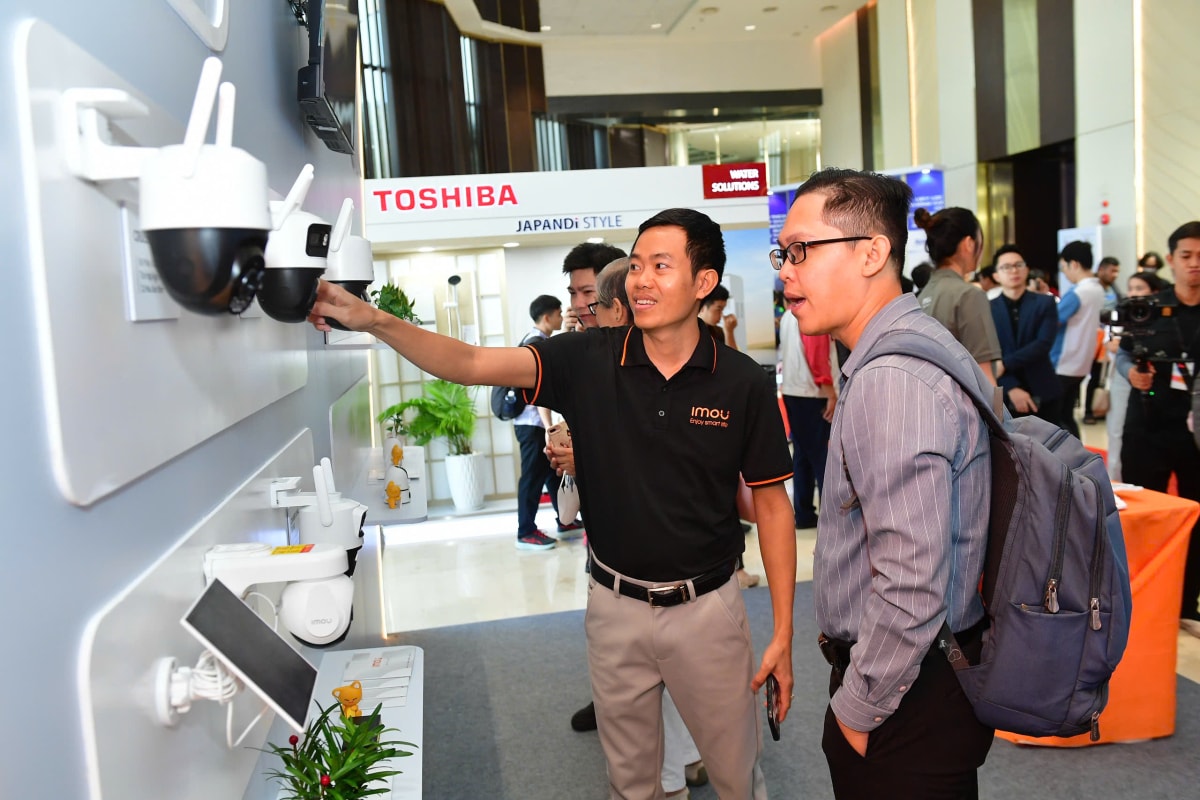 Khách tham quan tìm hiểu các công nghệ mới, chẳng hạn Imou với các giải pháp nhà thông minh mới, Toshiba với các mẫu máy giặt, nồi cơm điện, lò vi sóng thế hệ mới...