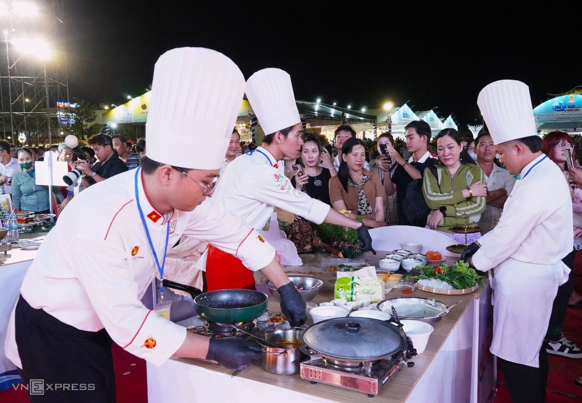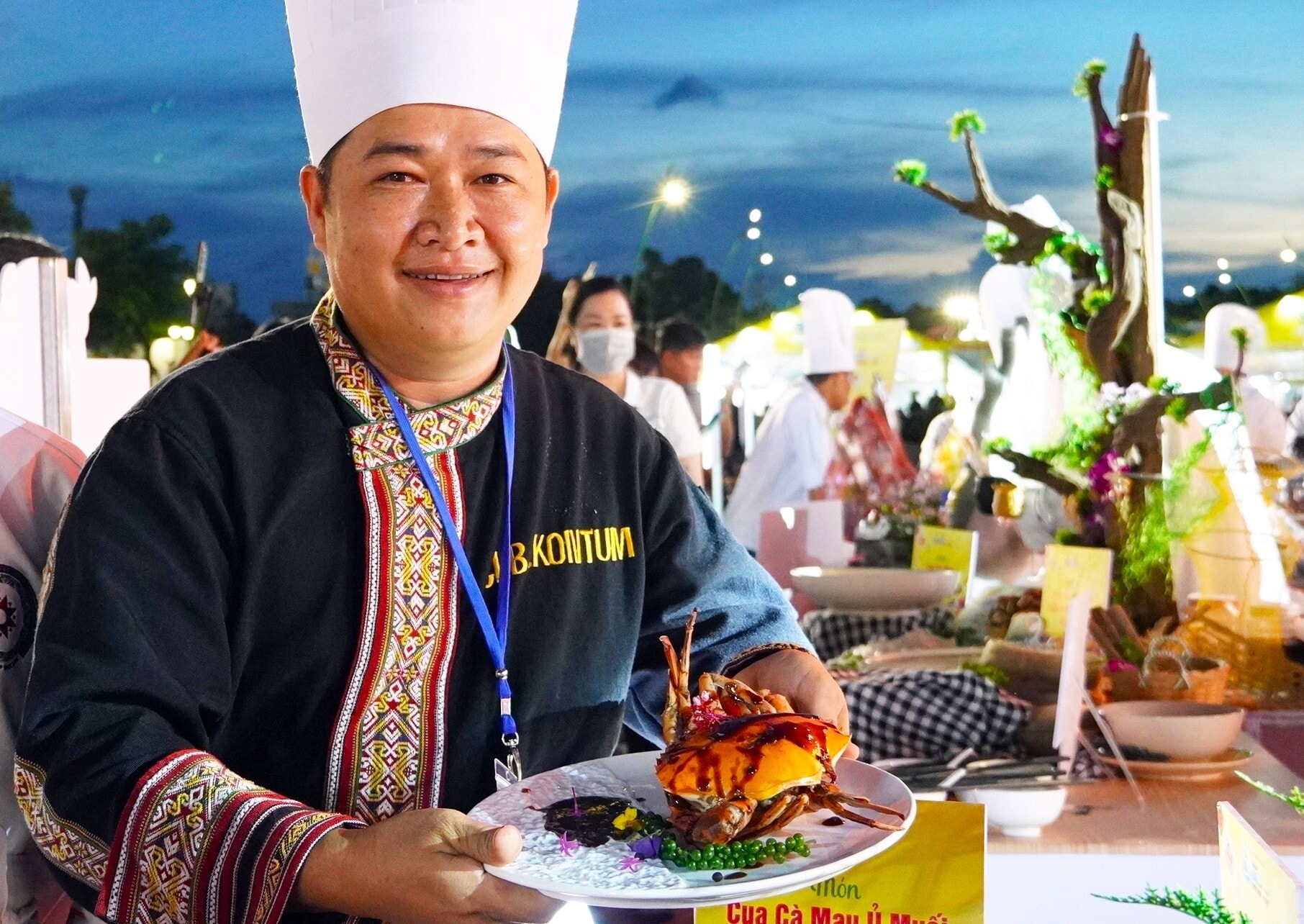 Các đầu bếp chuyên nghiệp chế biến 102 món ngon từ cua Cà Mau kết hợp đặc sản 34 tỉnh thành, phục vụ khách tham quan, trải nghiệm và nếm thử.