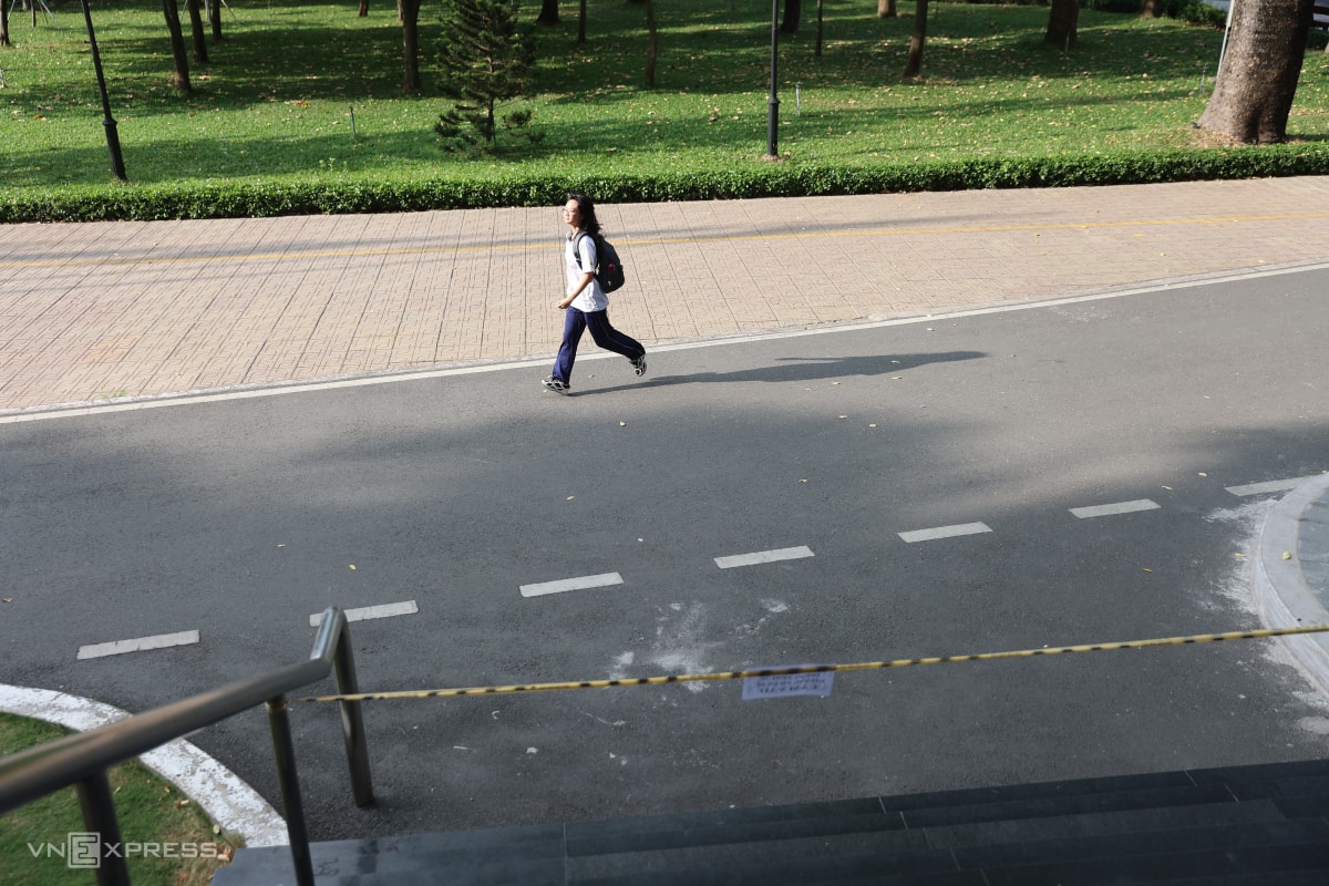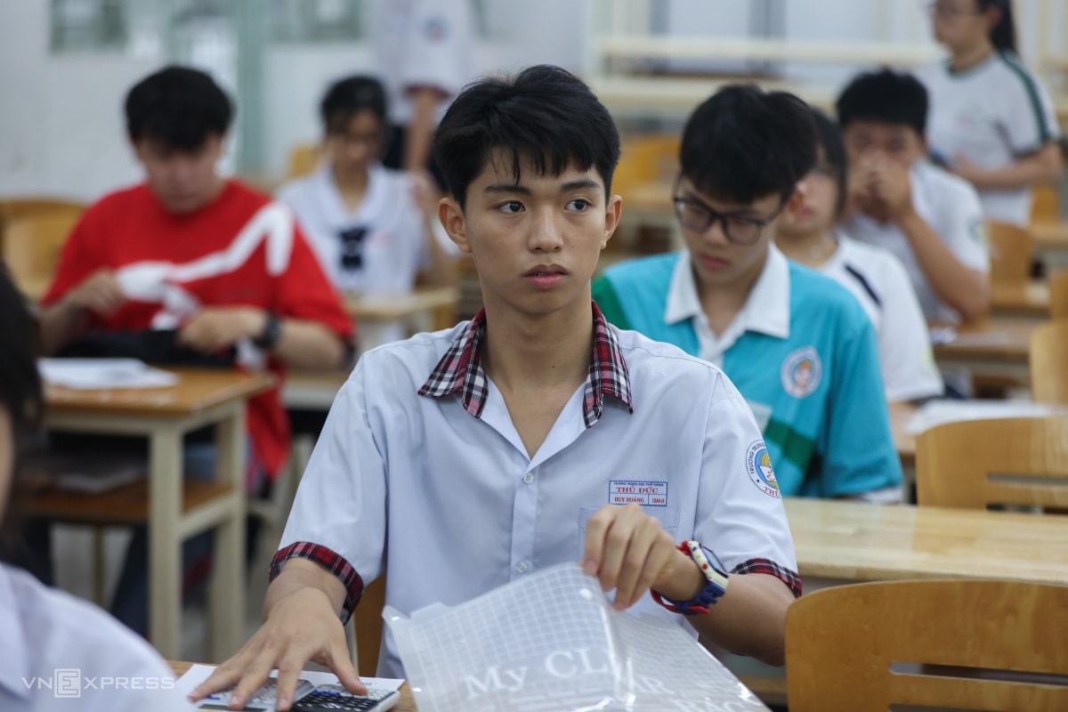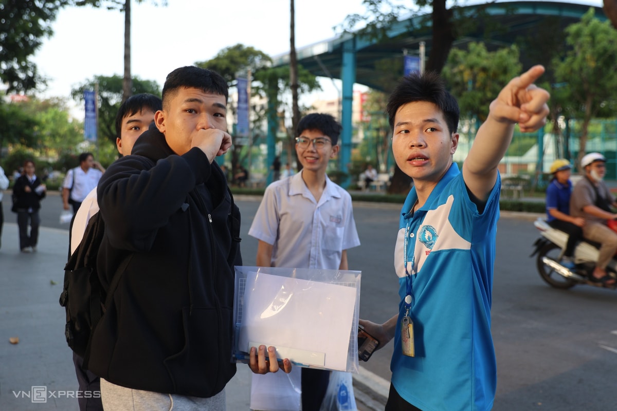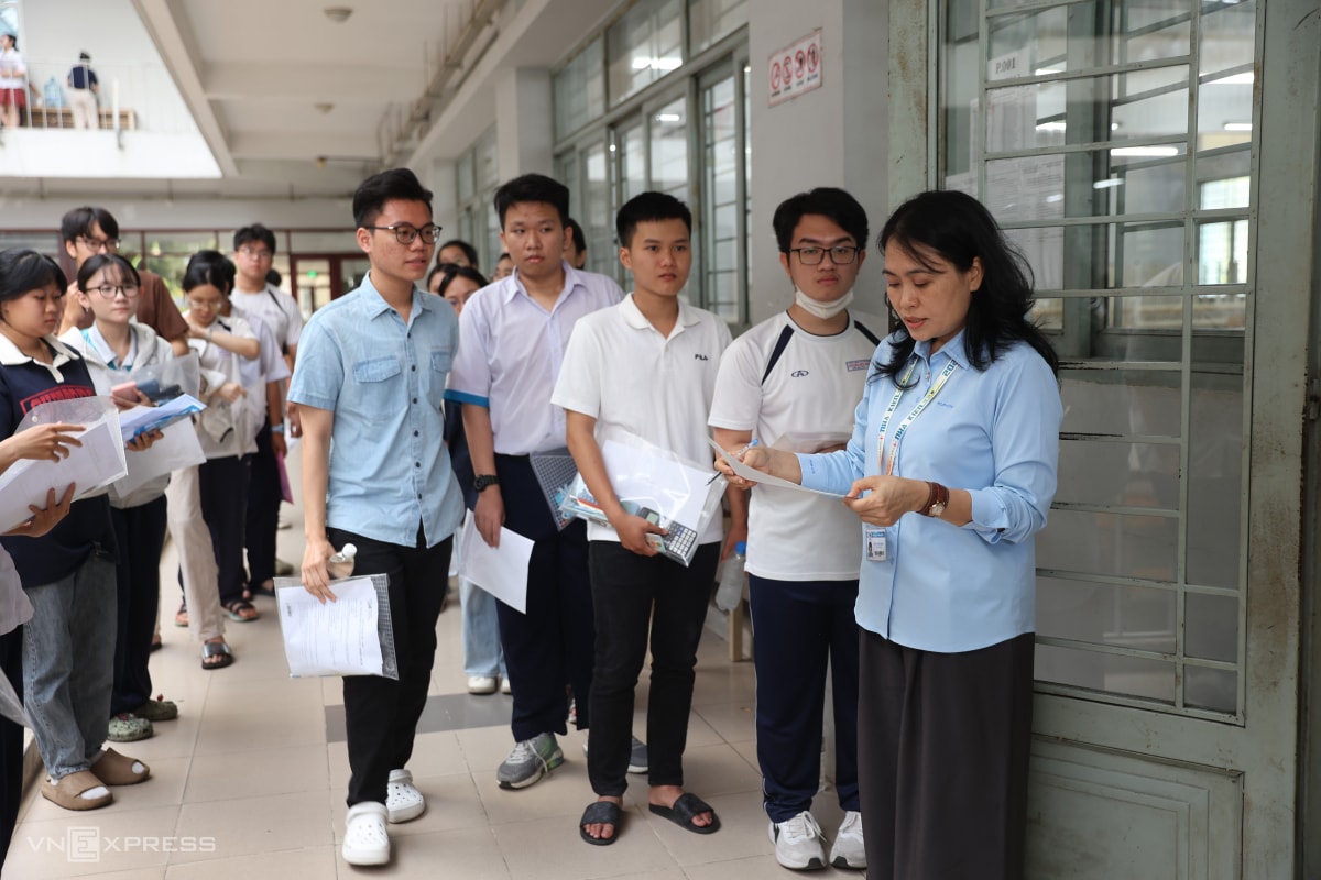 Khoảng 7h30, giám thị gọi thí sinh vào phòng thi ở trường Đại học Công nghệ Kỹ thuật TP HCM. Các em phải mang theo giấy báo dự thi kèm căn cước công dân hoặc hộ chiếu. Nếu không có, thí sinh được dùng VNEID nhưng phải làm cam kết. Những năm trước, nhóm này sẽ không được dự thi.