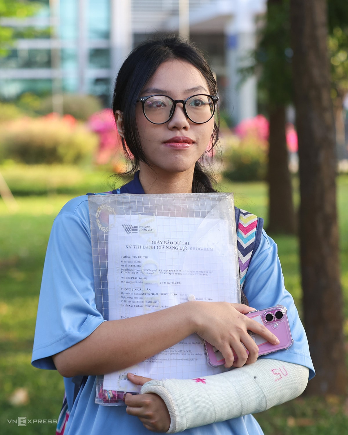Tay trái của Nguyễn Phạm Phương Thảo (THPT Hiệp Bình) phải bó bột sau khi bị trật khớp cách đây một tuần. Thảo thấy vẫn may mắn vì còn làm bài được.