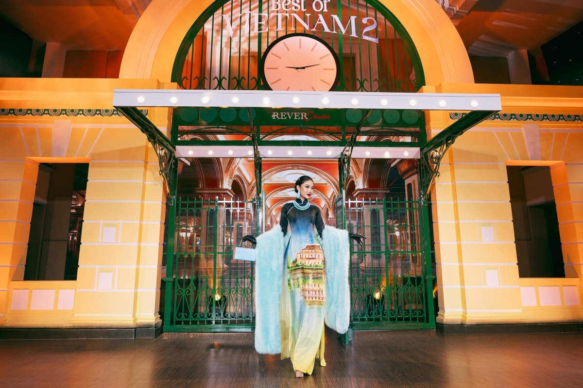 Đêm thi thời trang của cuộc thi diễn ra tối 11/12 trên du thuyền dài 120 m, 10.000 m2, neo giữa sông Sài Gòn. Không gian sàn diễn mô phỏng Bưu điện Thành phố - biểu tượng kiến trúc 130 năm tuổi của TP HCM - với mái vòm cong, khung sắt đối xứng và sắc vàng đặc trưng.