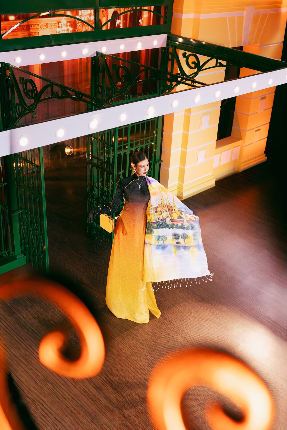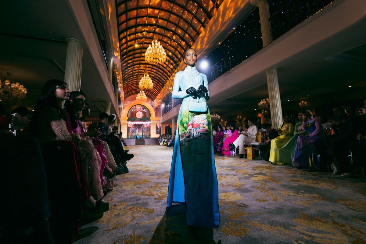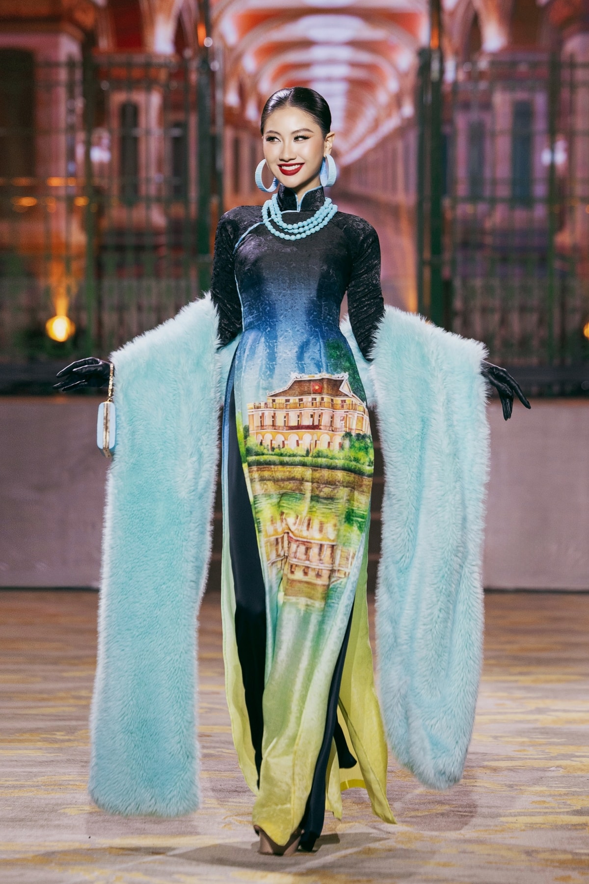 Thí sinh trình diễn bộ sưu tập áo dài Heritage in Heritage của nhà thiết kế Trung Đinh, tôn vinh bản sắc Việt, đồng thời giới thiệu văn hóa đến bạn bè quốc tế.