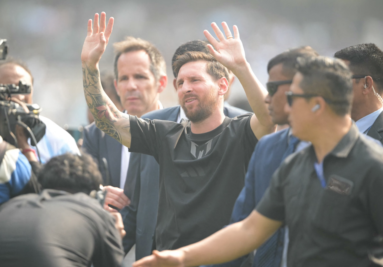 Nhưng tại điểm dừng đầu tiên, nhà vô địch World Cup 2022 chỉ đi một vòng quanh sân vẫy chào khán giả trong vòng vây an ninh dày đặc rồi rời đi sau khoảng 20 phút.