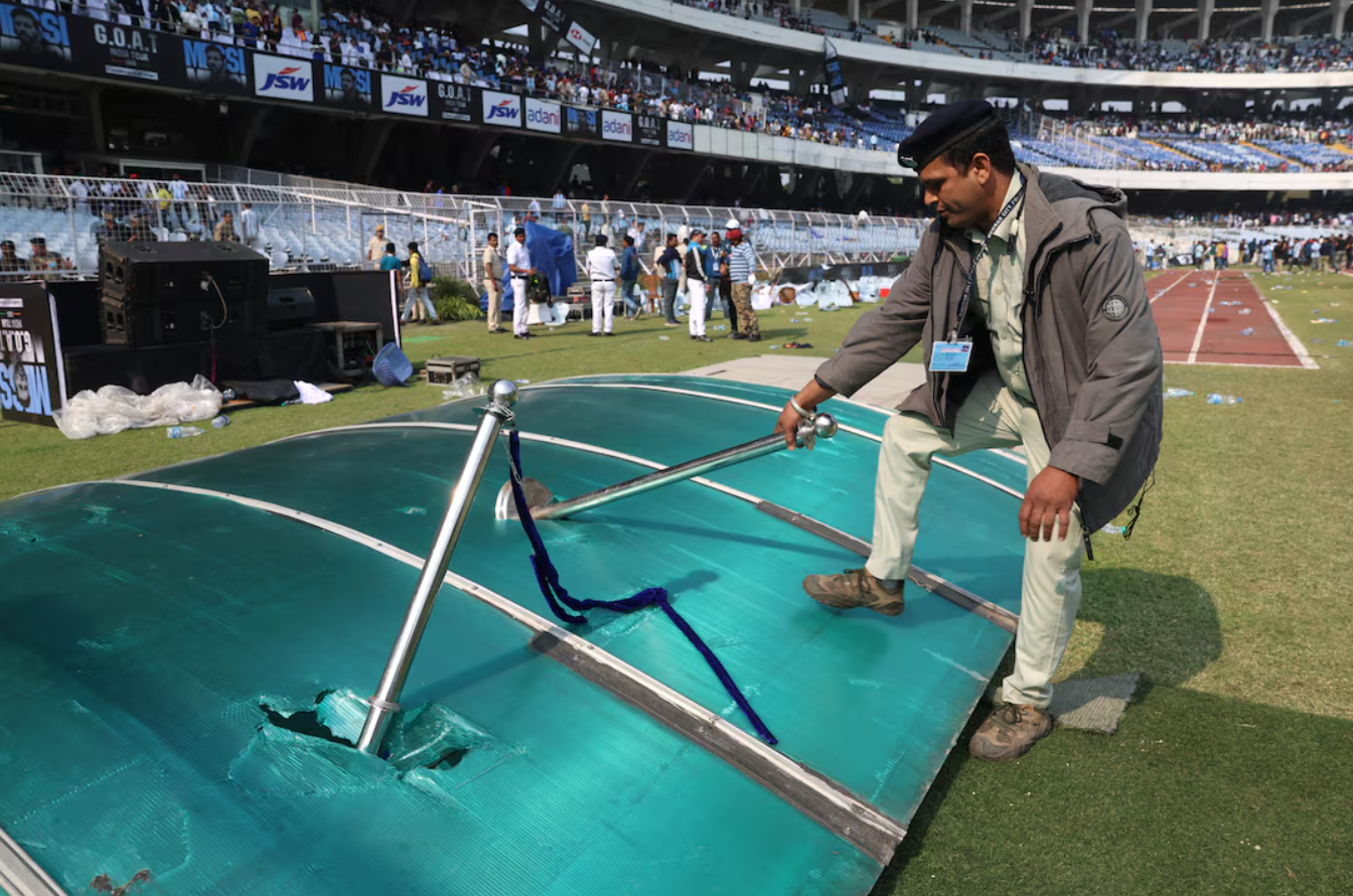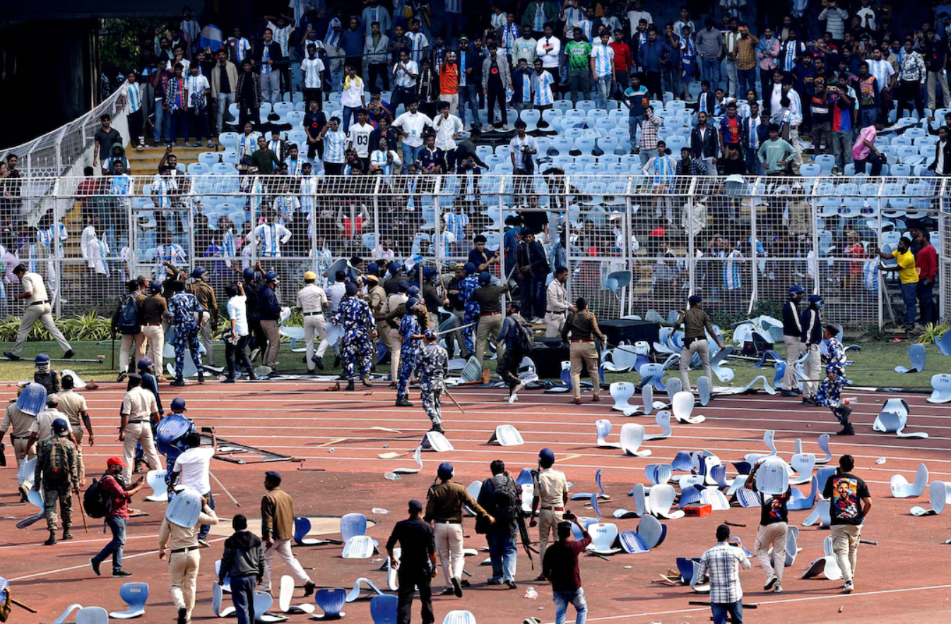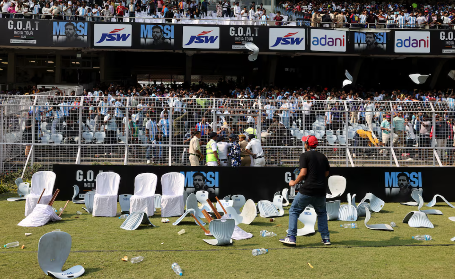 Sự xuất hiện chớp nhoáng của Lionel Messi tại sân Salt Lake, Kolkata kết thúc trong cảnh hỗn loạn khi người hâm mộ tràn xuống sân, phá hoại khán đài và ném ghế về phía mặt cỏ.