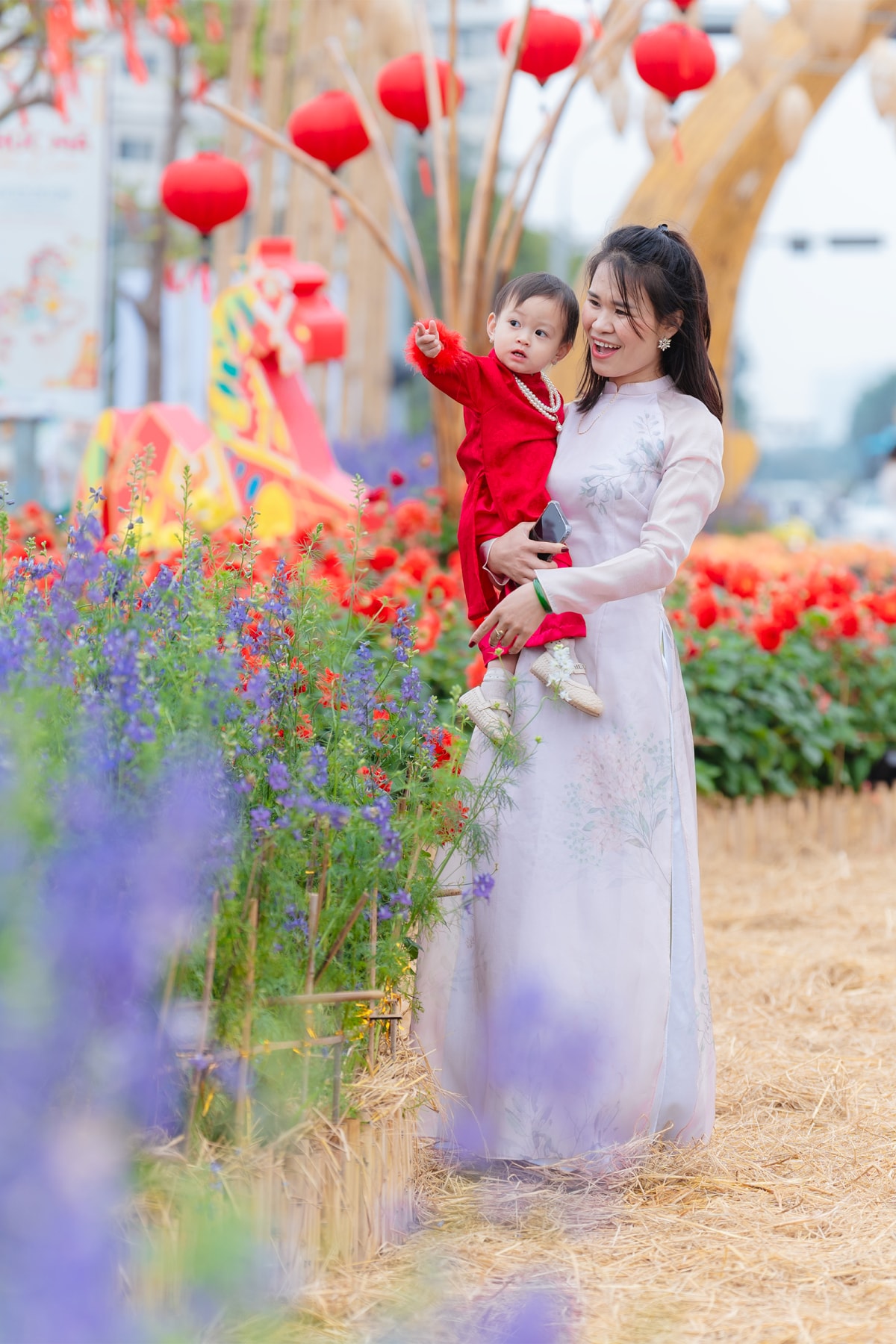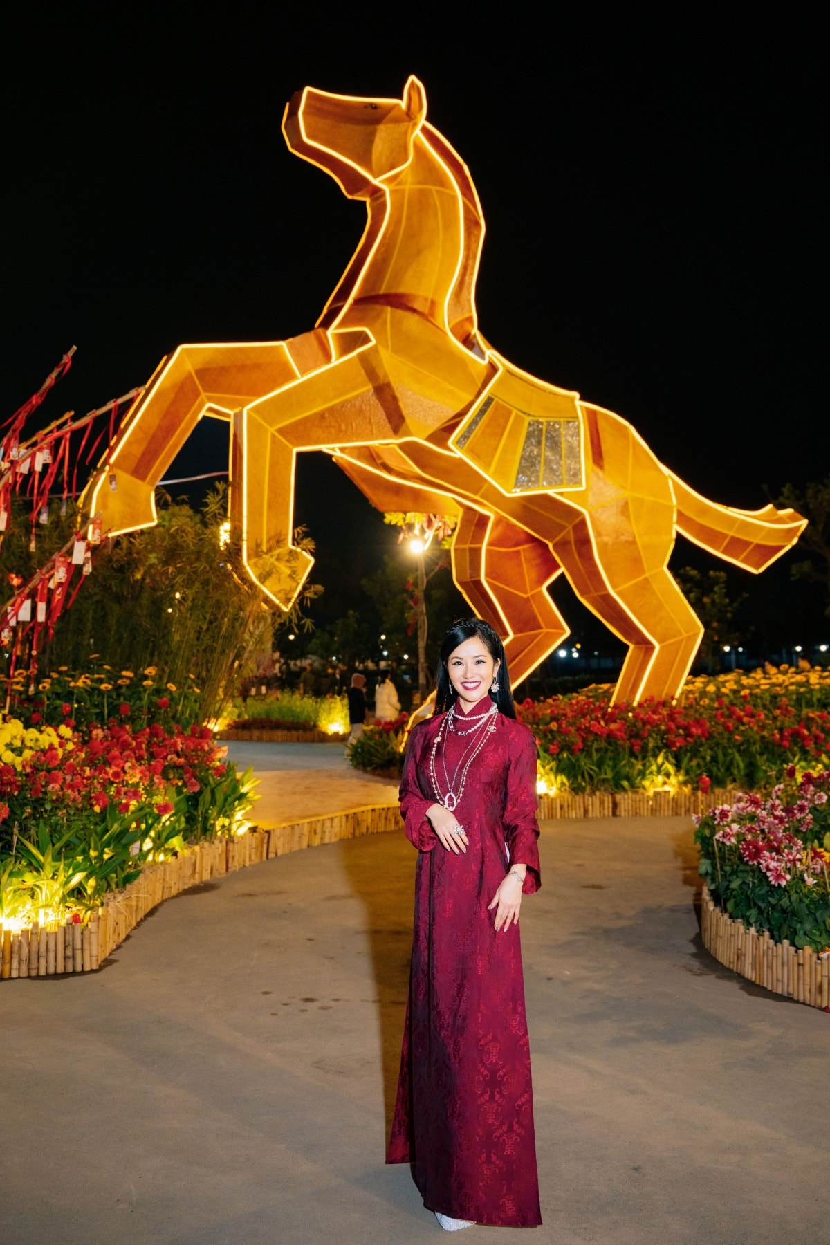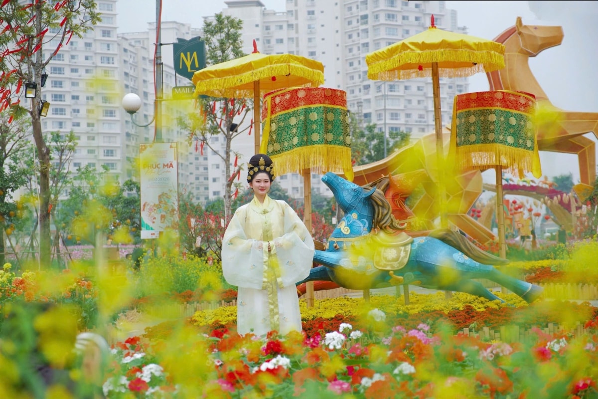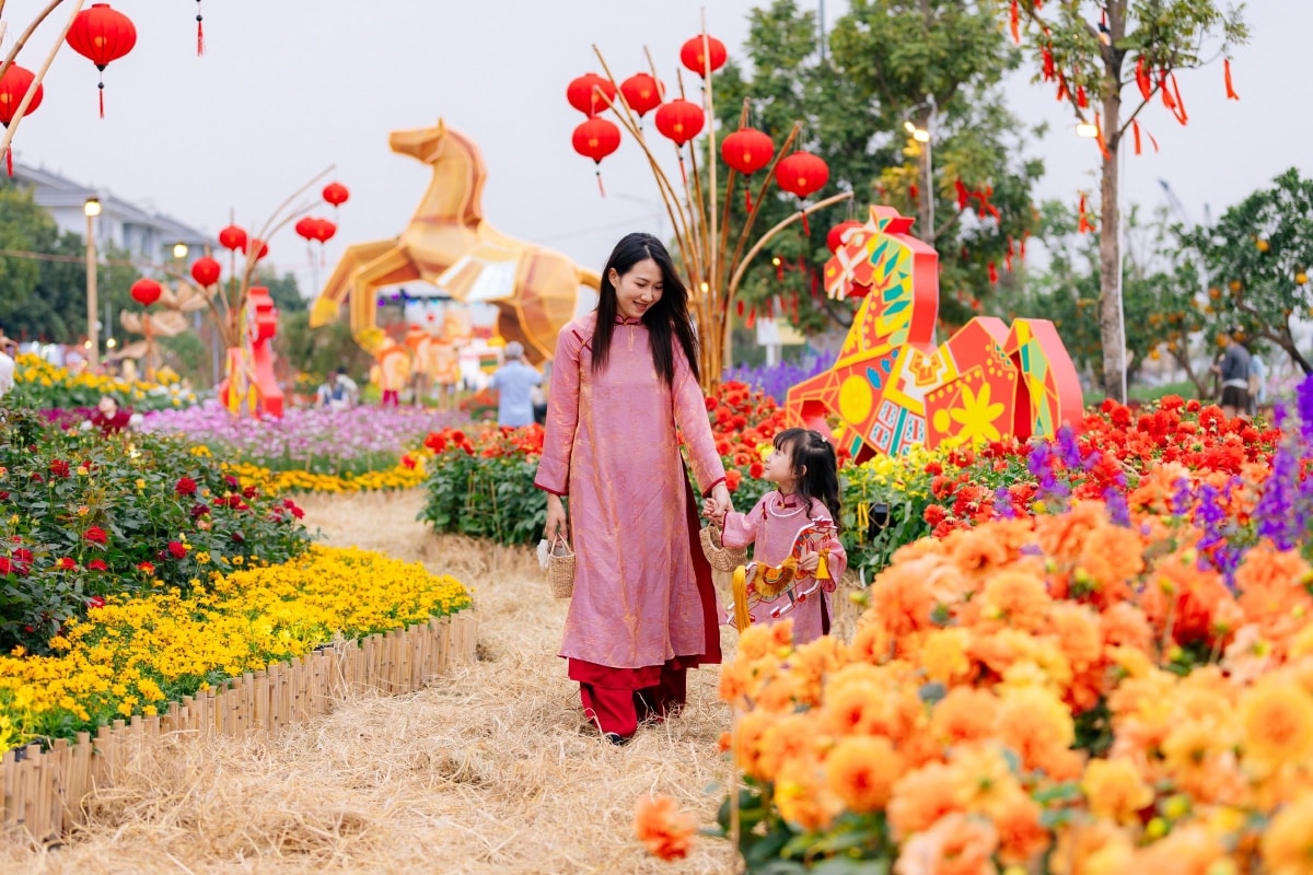 Diva Hồng Nhung cùng nhiều du khách, người dân lựa chọn áo dài, cổ phục khi tham quan vườn hoa Home Hanoi Xuan tại khu đô thị Mailand Hanoi City, Hà Nội.