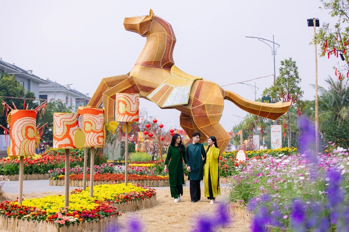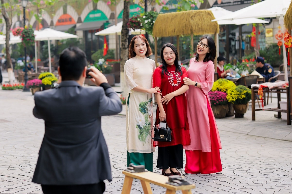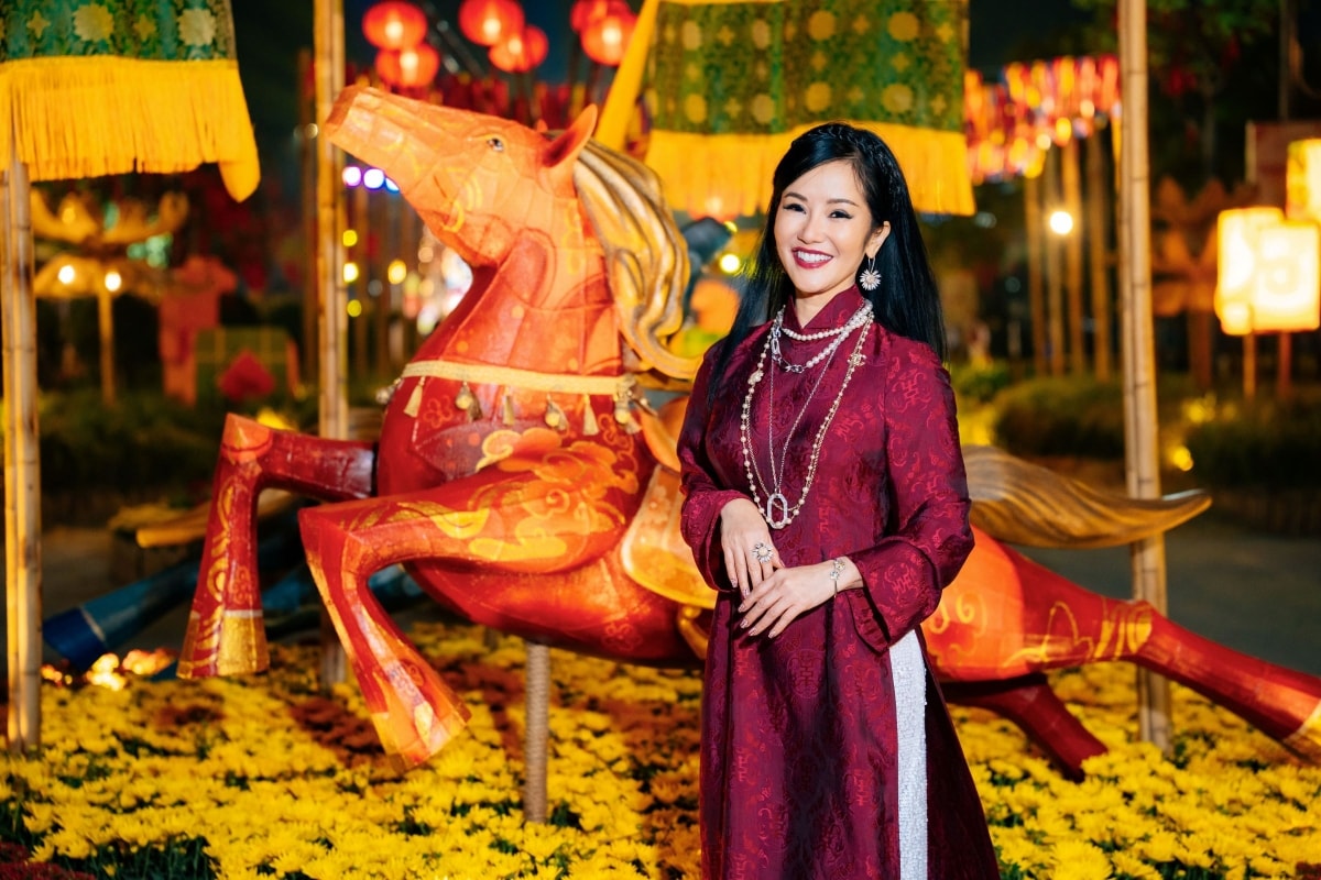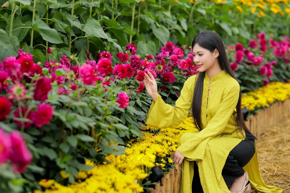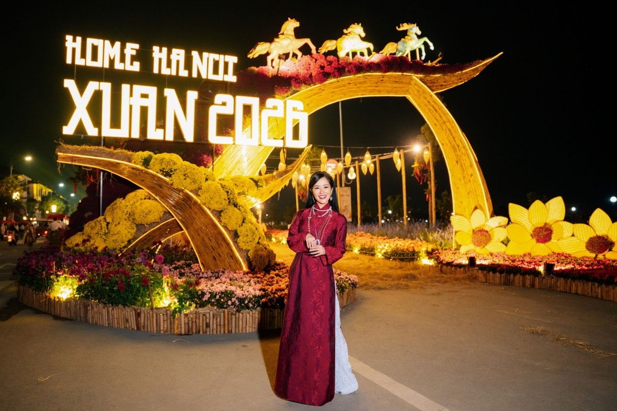 Diva Hồng Nhung cùng nhiều du khách, người dân lựa chọn áo dài, cổ phục khi tham quan vườn hoa Home Hanoi Xuan tại khu đô thị Mailand Hanoi City, Hà Nội.