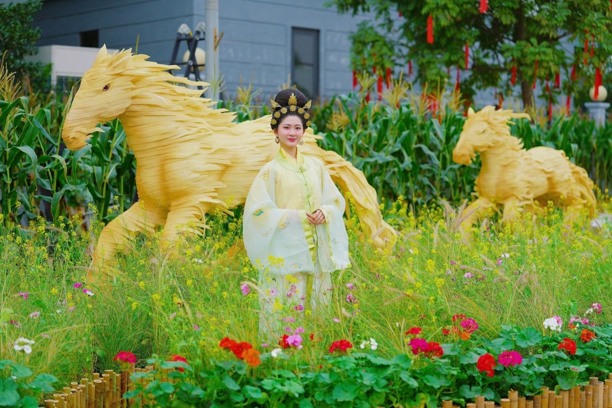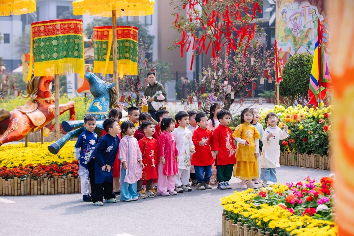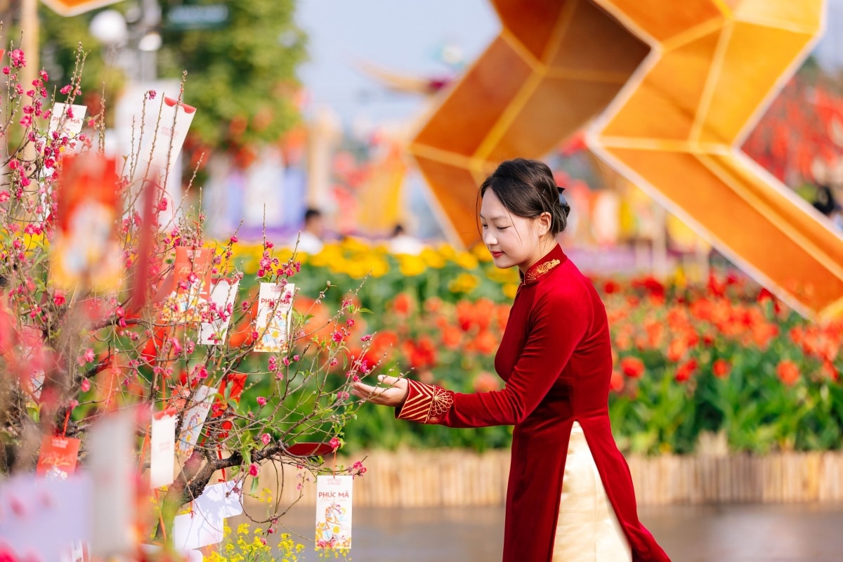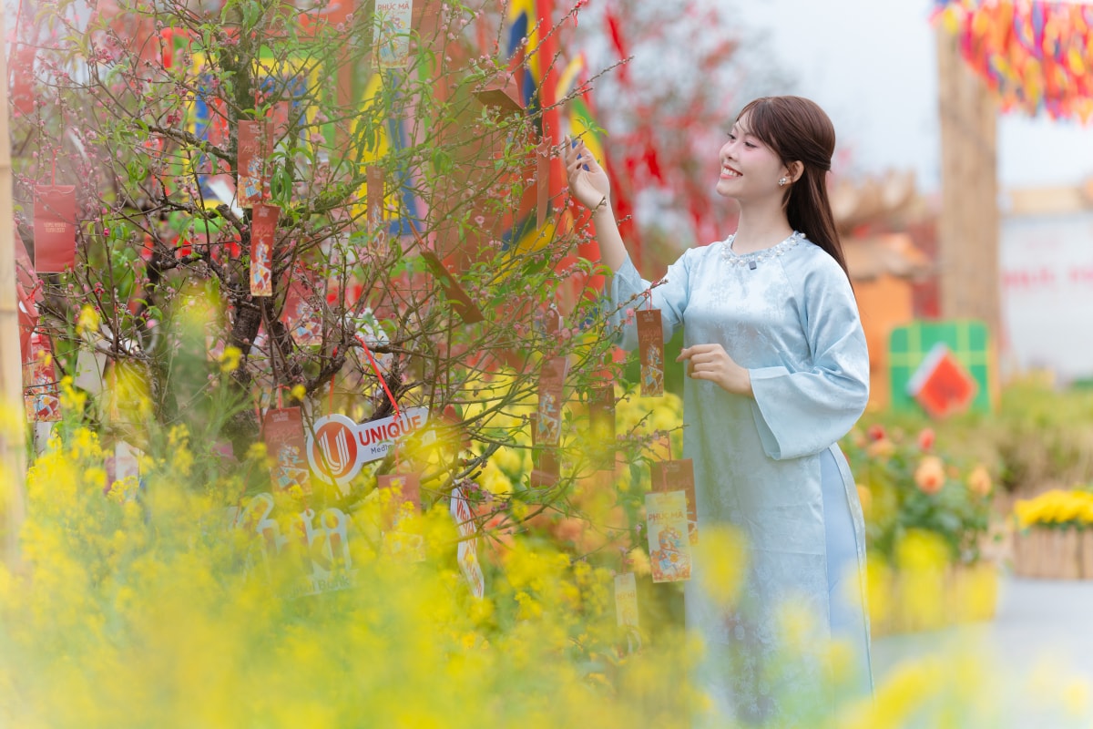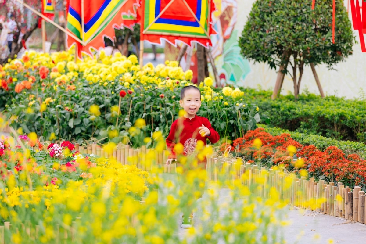 Diva Hồng Nhung cùng nhiều du khách, người dân lựa chọn áo dài, cổ phục khi tham quan vườn hoa Home Hanoi Xuan tại khu đô thị Mailand Hanoi City, Hà Nội.