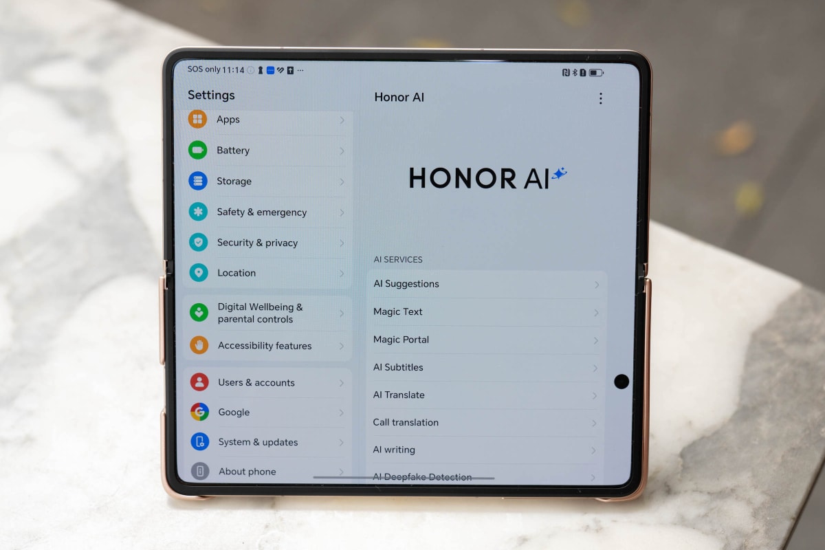 Nếp gấp giữa là nhược điểm của smartphone gập, nhưng trên Magic V5 khó thấy hơn, không làm ảnh hưởng đến trải nghiệm. Năm nay, Honor tập trung mạnh vào AI khi trang bị bộ công cụ với các tính năng riêng như Phát hiện giả mạo AI (AI Deepfake Detection) giúp cảnh báo các cuộc gọi video có sử dụng AI giả gương mặt, tránh lừa đảo. Tính năng này hỗ trợ các ứng dụng OTT như Facebook Messenger, Zalo... với thời gian nhận diện 3 giây.
