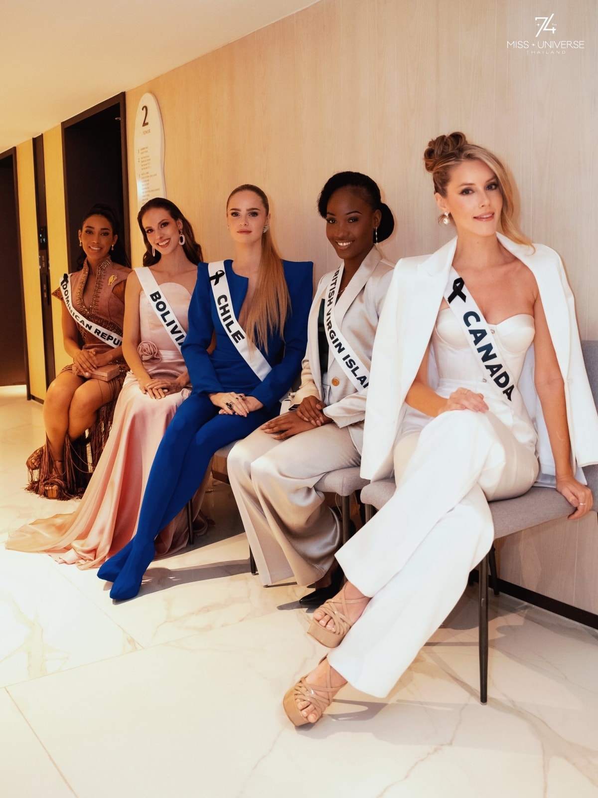 Hương Giang và các người đẹp diện trang phục đơn sắc, tiết chế phụ kiện khi tham gia vòng phỏng vấn kín tại Miss Universe 2025.