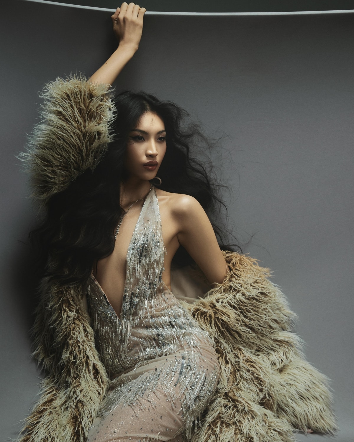 Người mẫu Gen Z Huỳnh Tú Anh tạo dáng với trang phục cut-out, xuyên thấu tôn eo con kiến 60 cm.