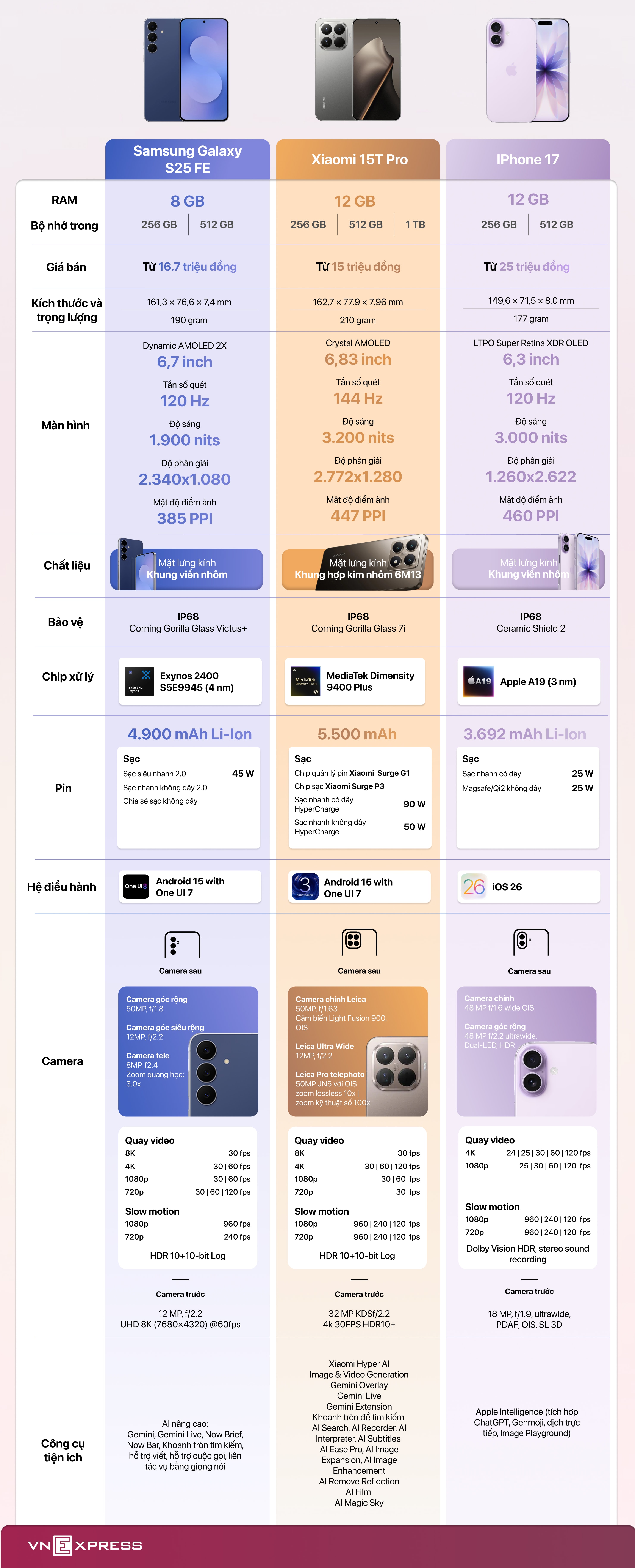 iPhone 17 nâng cấp lớn so với thế hệ trước, lợi thế hệ điều hành iOS nhưng nhiều thông số cấu hình thấp hơn Xiaomi 15T Pro và S25 FE.