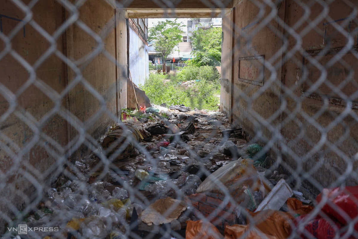 Những căn bàn giao được rào kín nhưng chưa thể dỡ bỏ hoàn toàn do vướng nhà bên cạnh. Bên trong thành nơi tập kết rác thải, cây cỏ mọc um tùm.