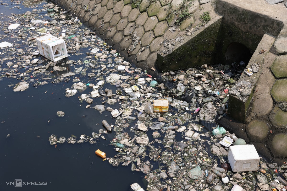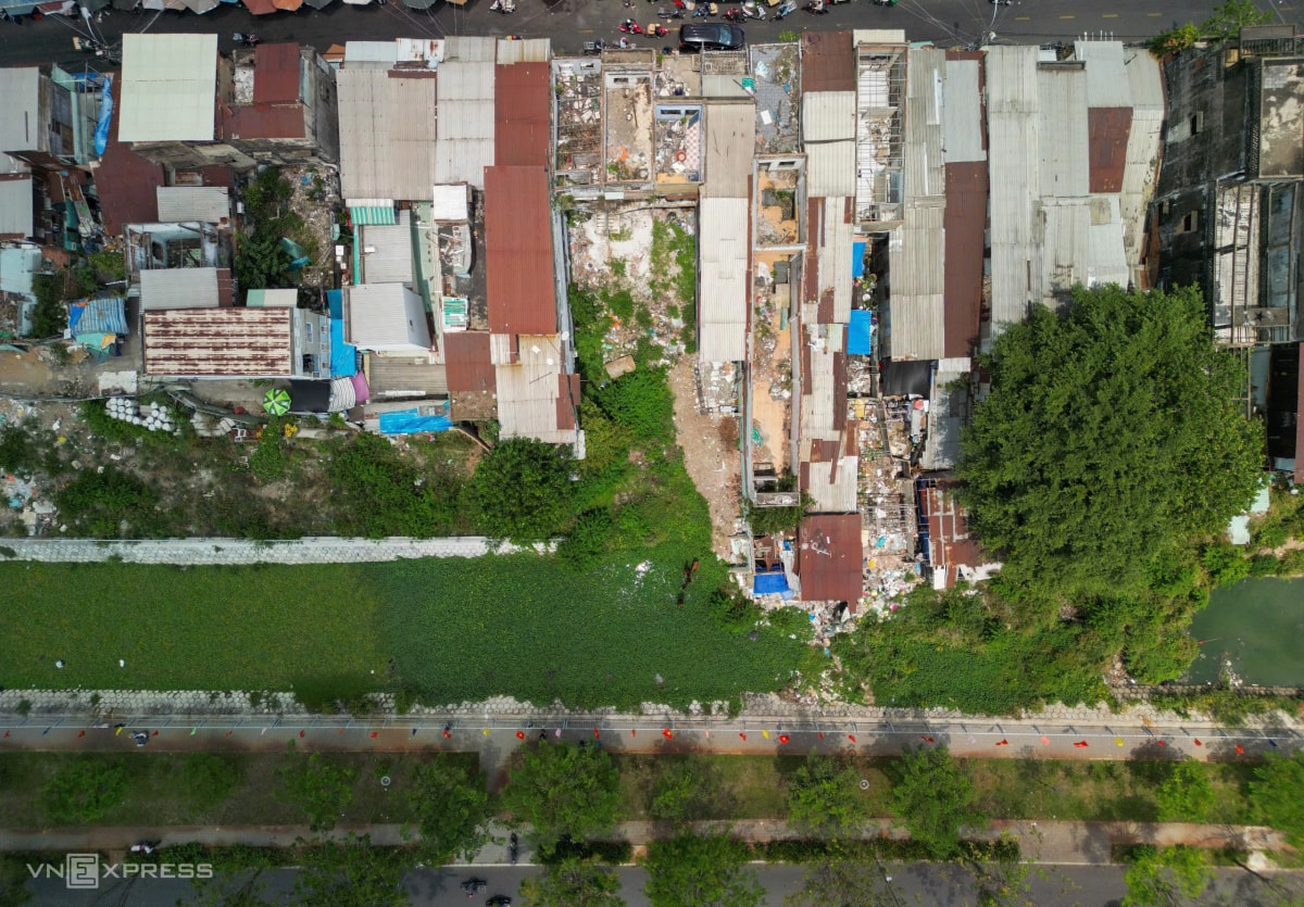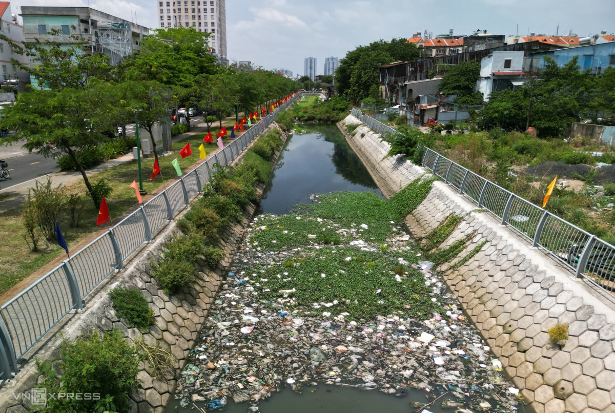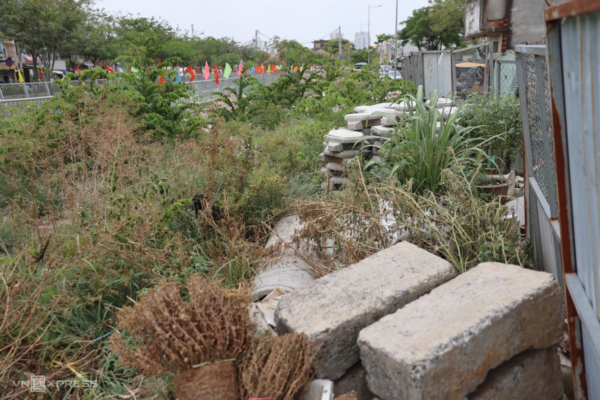 Do chưa thể khơi thông dòng chảy, đoạn kênh trở thành ao tù, phủ kín lục bình, cây dại và rác thải. Trên bờ được rào chắn tạm bờ, ngổn ngang vật liệu xây dựng, không có dấu hiệu thi công.