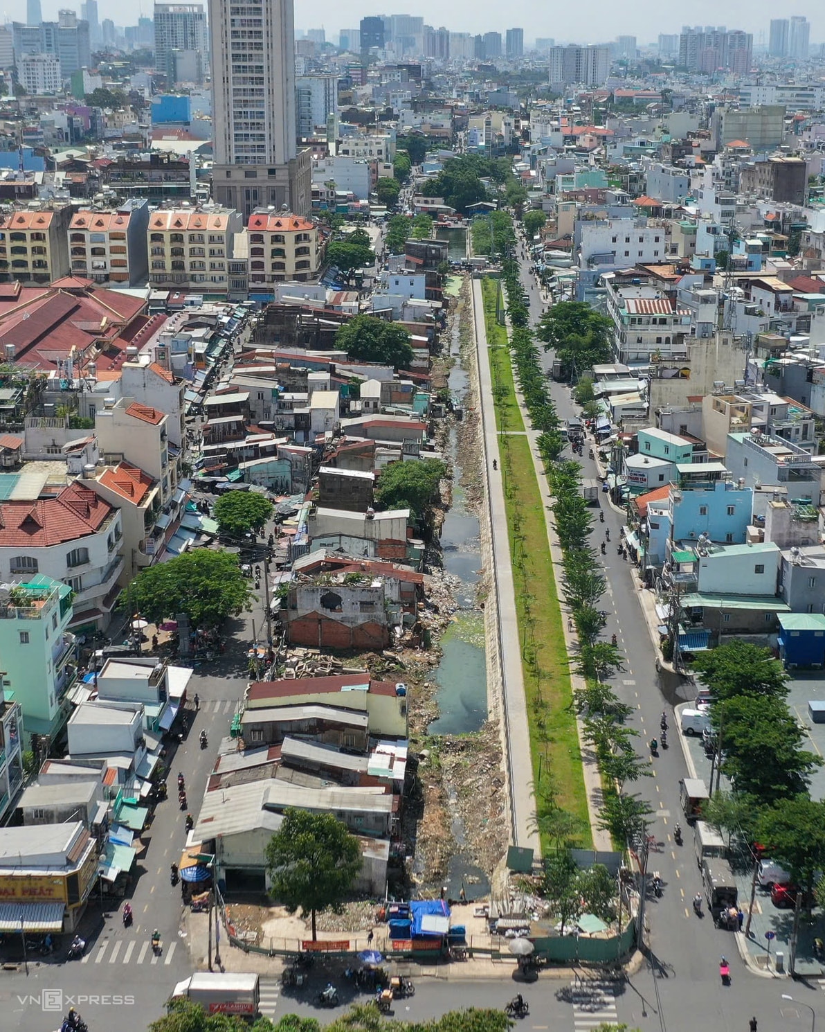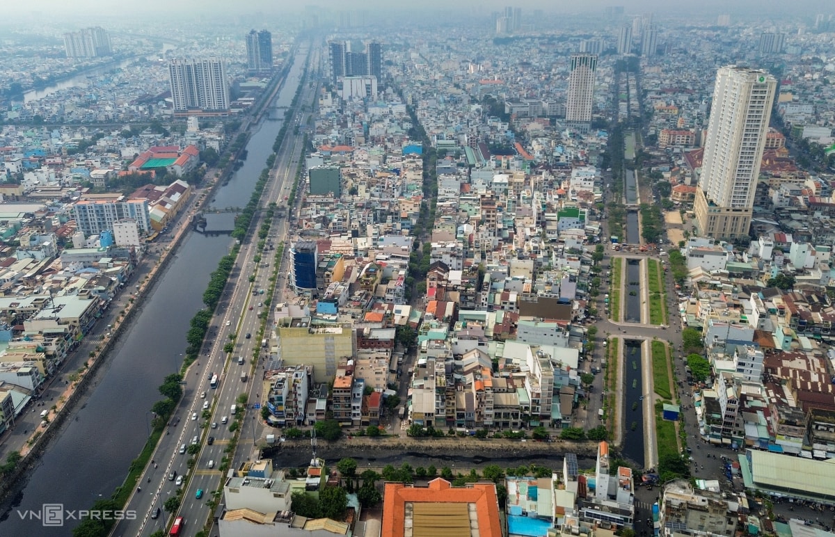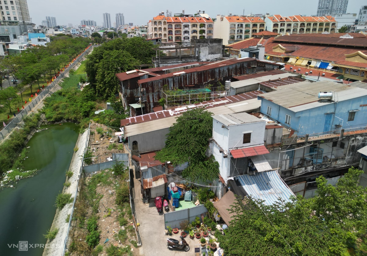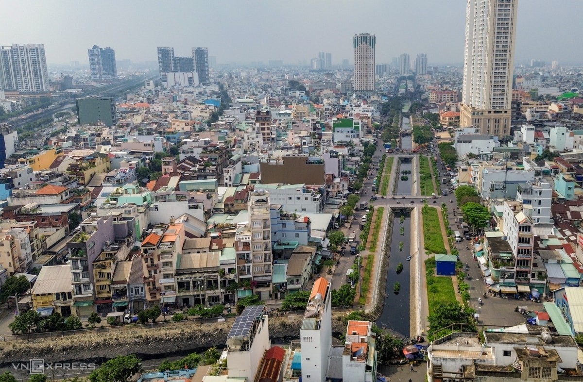 So với ảnh cách đây 3 năm, công trình đã cơ bản xong lòng kênh, bờ kè, đường và cảnh quan hai bên. Nhiều hộ dân đã bàn giao nhưng còn vướng dãy nhà sau lưng chợ Bình Tây chưa giải tỏa, khiến đoạn này chưa thể hoàn thiện theo đúng tiến độ dịp 30/4 này.