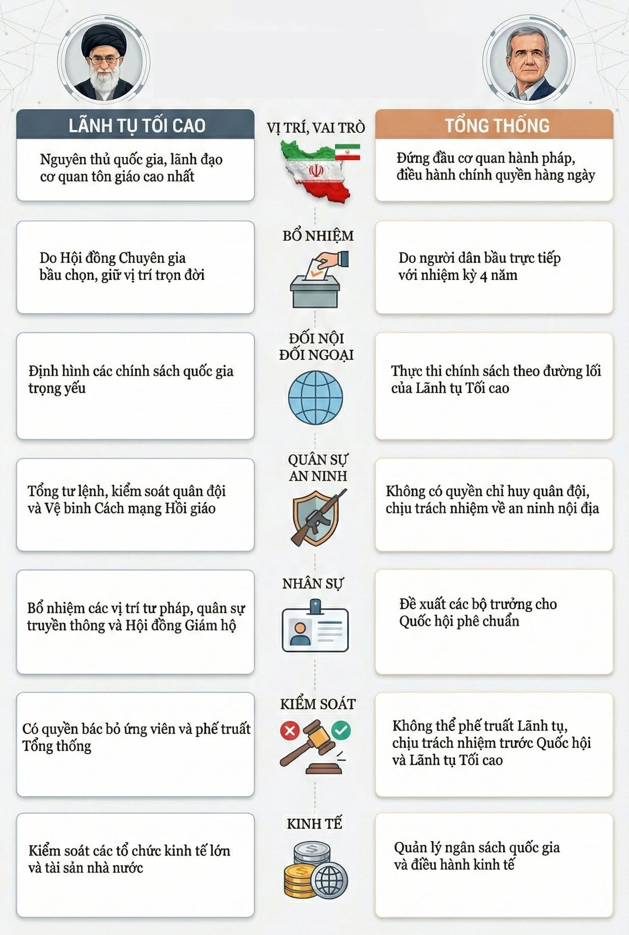 Lãnh tụ Tối cao nắm quyền lực cao nhất trong bộ máy chính trị và quân sự Iran, trong khi Tổng thống đứng đầu nhánh hành pháp, điều hành chính quyền hàng ngày.