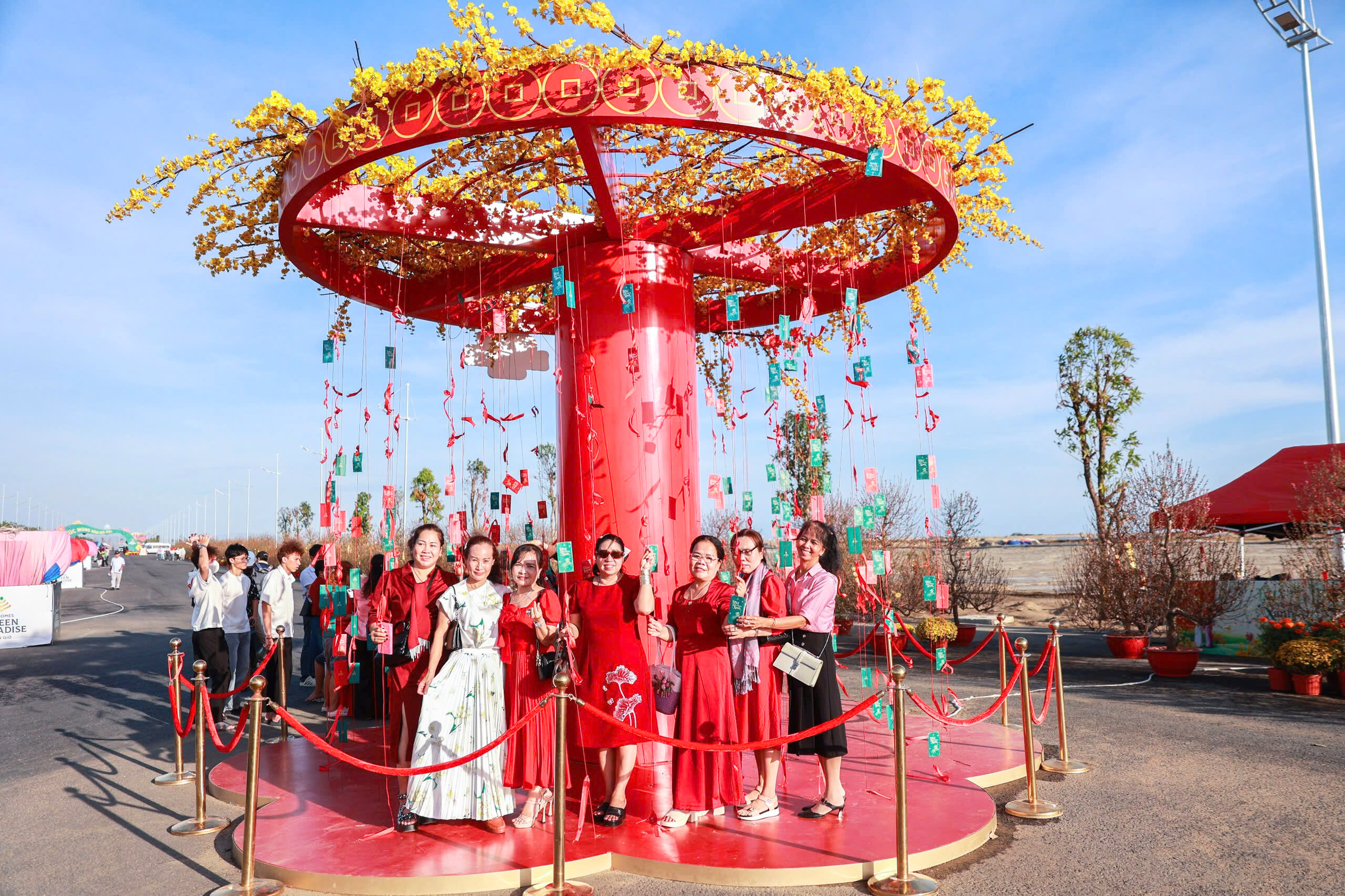 Bên cạnh cầu may mắn đầu năm cùng mai đào, du khách đến lễ hội xuân Cần Giờ còn có cơ hội xin lộc đầu năm tại cây lì xì khổng lồ, ở ngay cạnh sân khấu trung tâm sự kiện. Với chiều cao 4 mét, đường kính 6 mét, cây treo 2026 bao lì xì mỗi ngày, bên trong chứa lời chúc năm mới cùng các phần quà như voucher dịch vụ ẩm thực và cây xanh. Ngoài ra, trong 3 khung giờ cố định mỗi ngày, khách tham quan có cơ hội nhận các phần quà đặc sản đặc trưng của dịp Tết như giò, nem chua và rượu vang.