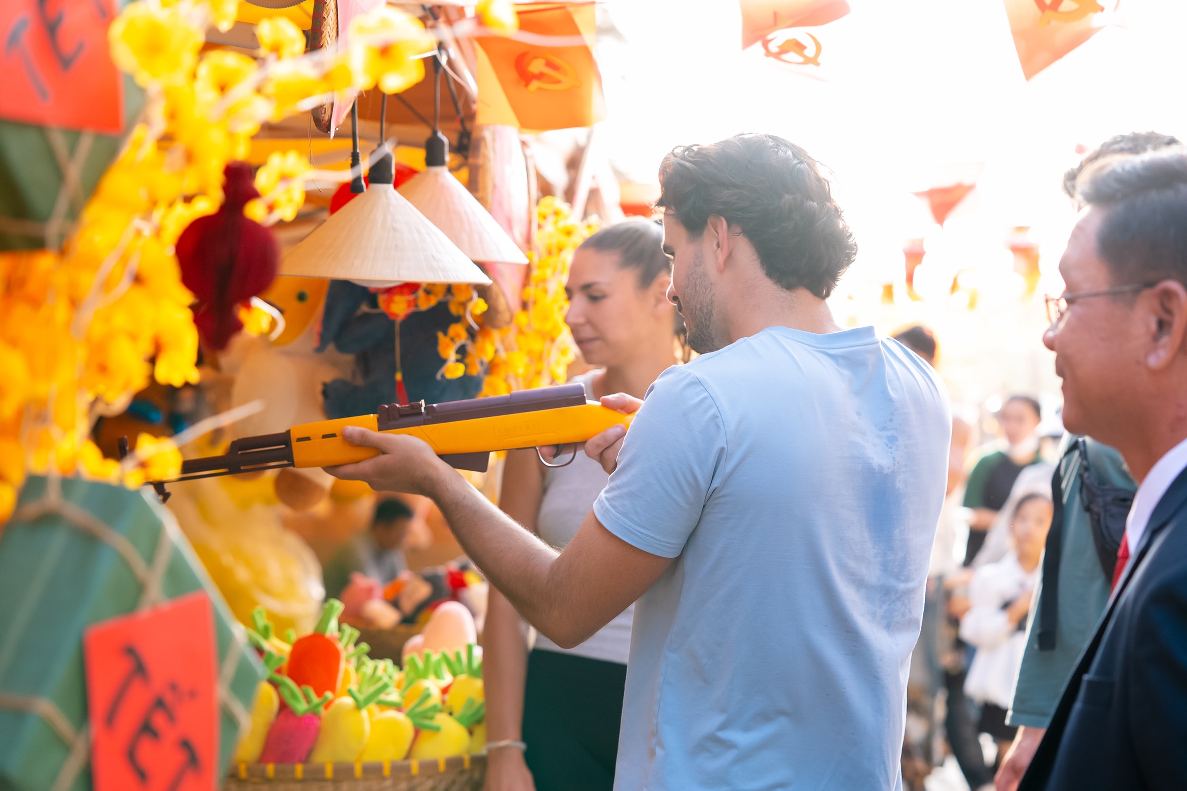 Những hoạt động vui chơi giúp du khách thêm sảng khoái. Từ các gian hàng vui chơi có thưởng đến các trò chơi hoạt náo như phi lao ống tre, gánh lúa qua cầu, tô màu mặt gỗ, kéo co thu hút cả du khách người Việt lẫn người nước ngoài.