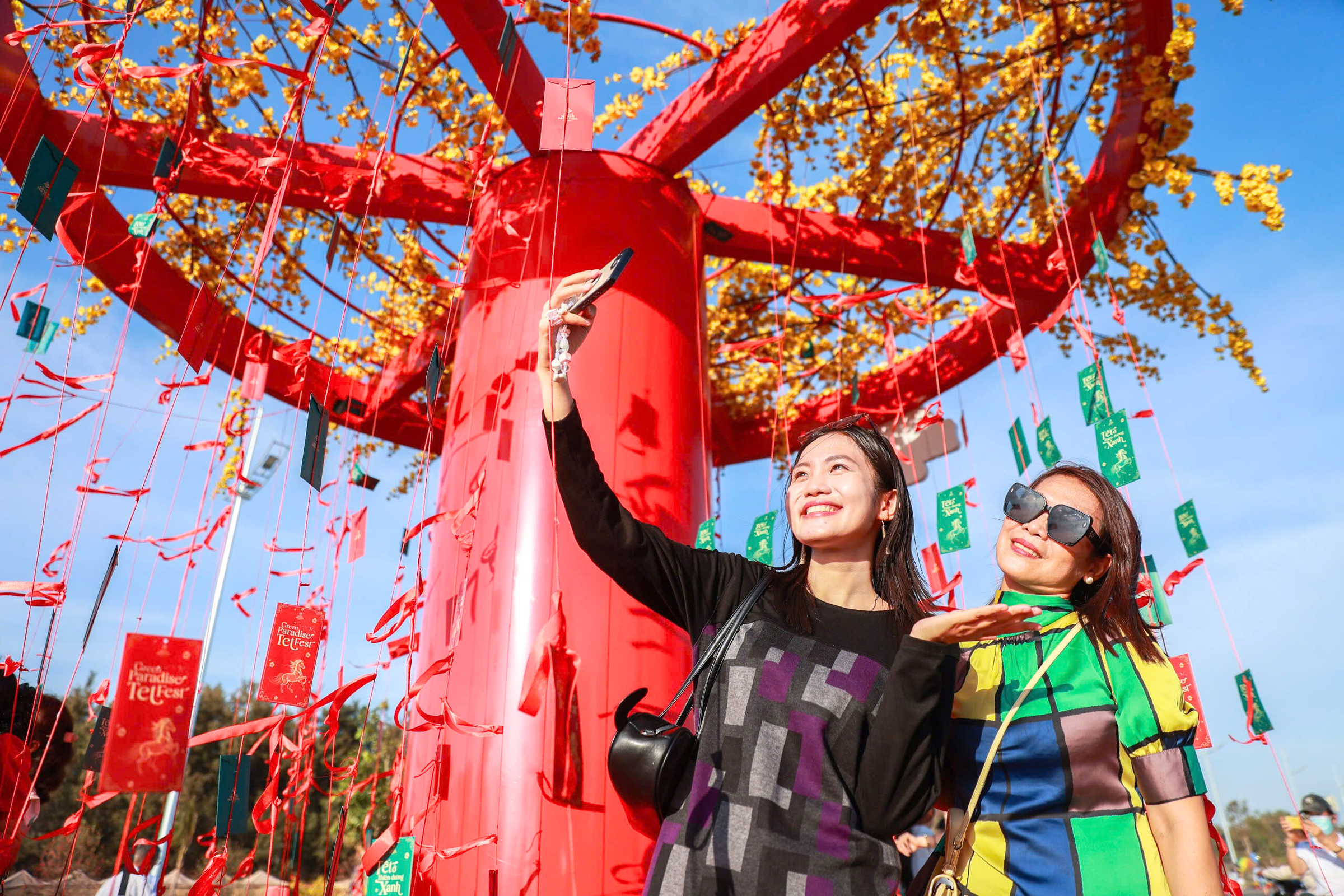 Bên cạnh cây mai 150 tuổi, sự kiện Green Paradise Tet Fest (diễn ra tại trục đường trung tâm khu đô thị Vinhomes Green Paradise) còn trưng bày 300 gốc mai và 300 gốc đào. Theo quan niệm dân gian, mai vàng rực rỡ tượng trưng cho tài lộc, may mắn. Đào hồng gửi gắm những mong muốn gắn kết và hòa thuận, cũng là biểu trưng của sự thịnh vượng, ấm cúng. Nhiều du khách chọn ghé thăm đúng thời điểm hoa nở để lưu giữ khoảnh khắc đầu năm, mong điều tốt lành cho bản thân và gia đình.