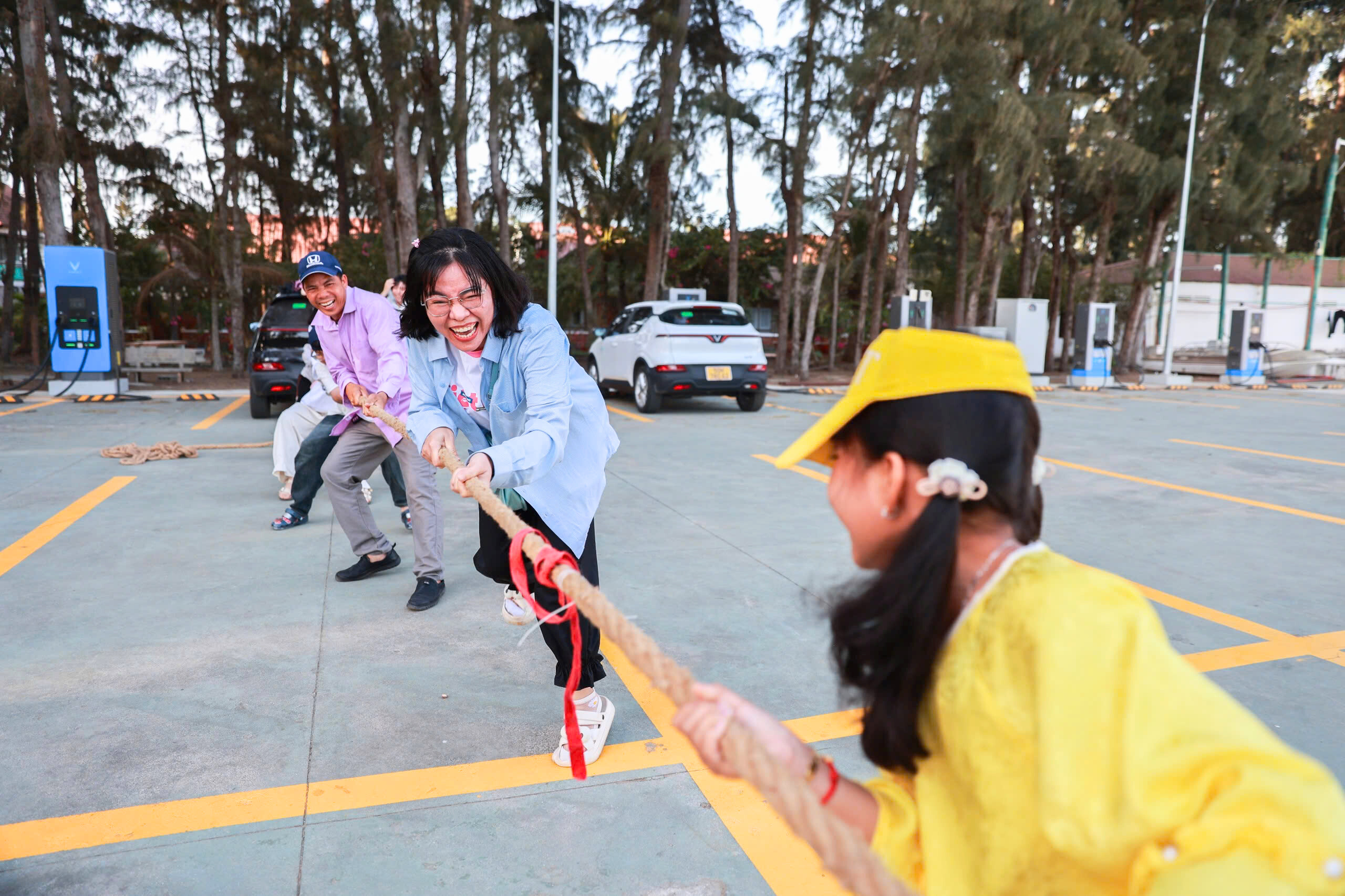 Nhiều du khách còn kết hợp tìm hiểu dự án bất động sản tại Vinhomes Green Paradise. Đại gia đình 12 người của chị Quế Anh (45 tuổi, Đồng Tháp) hào hứng tham gia kéo co cùng nhiều trò chơi khác tại hội xuân. "Tôi biết đến dự án cả năm nay, nay mới có dịp đi tìm hiểu thực tế, hy vọng sẽ có dịp đầu tư ở đây", chị nói.