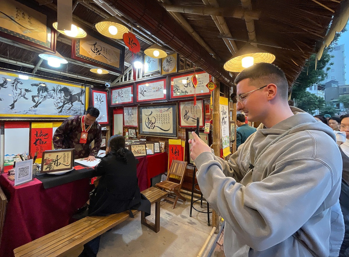 "Tôi đã ăn bún chả, phở, nem rán, món nào cũng ngon. Hôm nay được đến đây để tìm hiểu sâu hơn về văn hóa Việt Nam", Hecht nói. Anh say sưa với các hoạt động, tò mò về thư pháp và liên tục chụp ảnh.