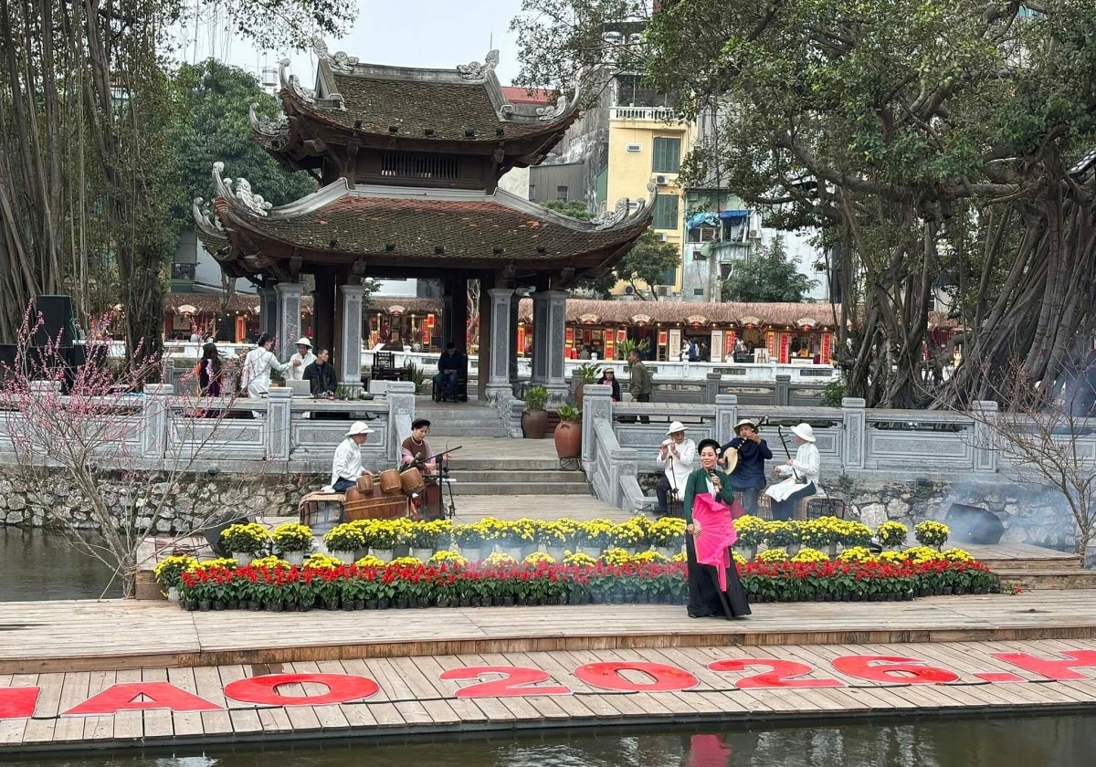 Năm nay, cảnh quan khu di tích Hồ Văn nằm trong quần thể Trung tâm Hoạt động Văn hóa, Khoa học Văn Miếu - Quốc Tử Giám được trang trí hài hòa giữa yếu tố truyền thống và tinh thần đương đại.
