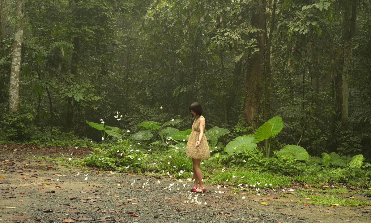 Khung cảnh bướm bay ở khu vực hồ cạnh cổng vườn. Theo kinh nghiệm của Hạnh Hạnh, thời điểm dễ săn bướm nhất là những ngày sau mưa. Đầu tháng 5 dễ bắt gặp bướm nhiều màu. Video: Hung Phan