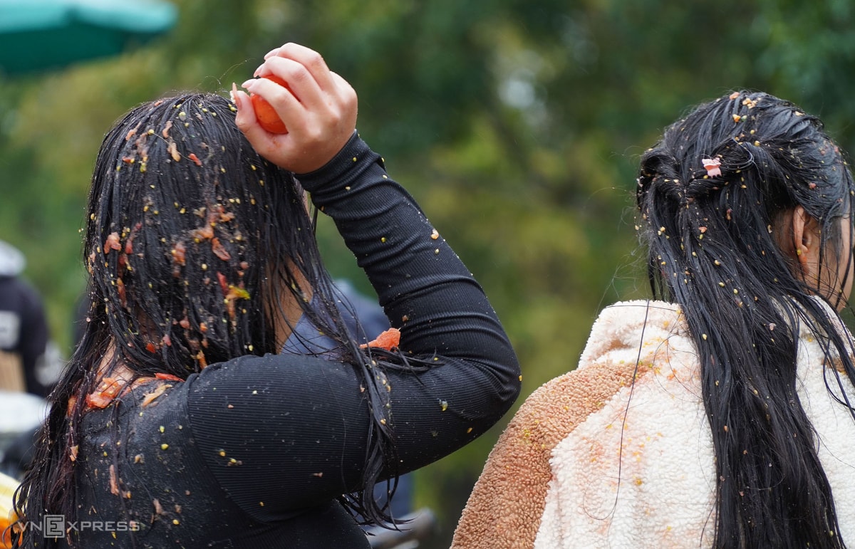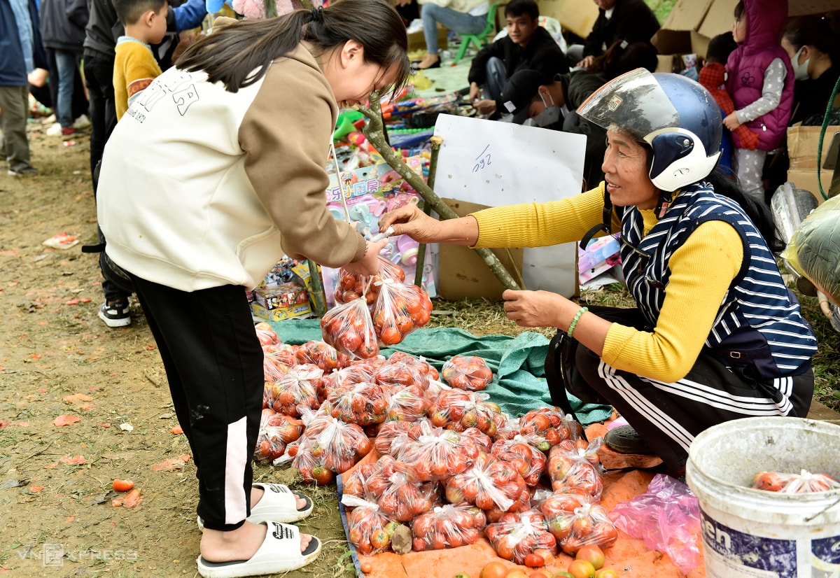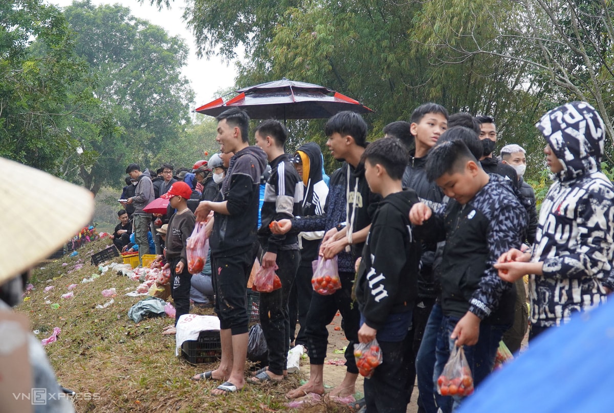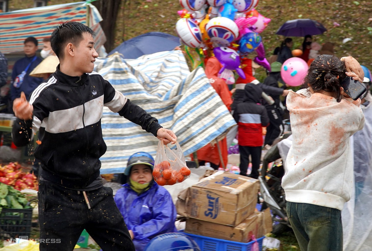 Hàng nghìn du khách và người dân đổ về chợ Chuộng mua cà chua, trứng thối ném nhau, với quan niệm ai "trúng đạn" càng nhiều càng gặp may trong năm mới.