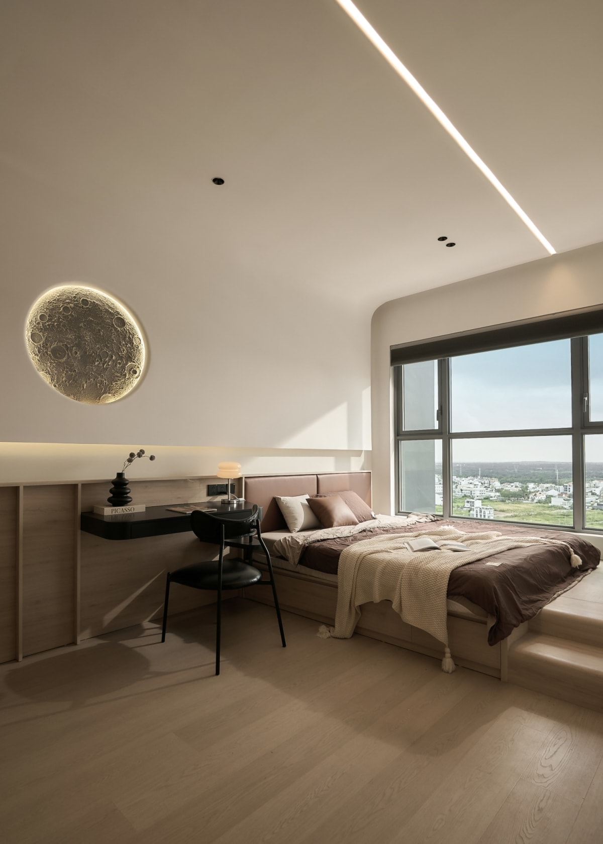 Phía sau cánh cửa phòng ngủ master, bức tranh mặt trăng được bố trí giúp mang lại cảm xúc thư giãn khi bước vào không gian riêng. Gia chủ thường chỉ ở nhà vào buổi tối, hình ảnh mặt trăng được lựa chọn nhằm gợi cảm giác tĩnh lặng và yên bình.