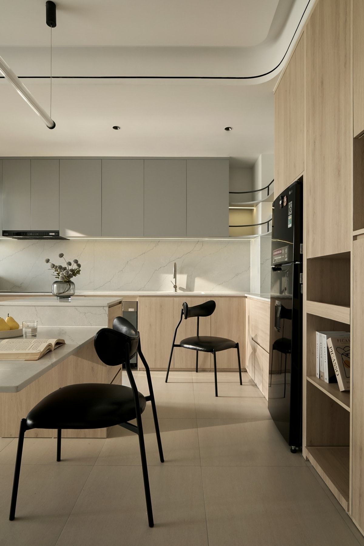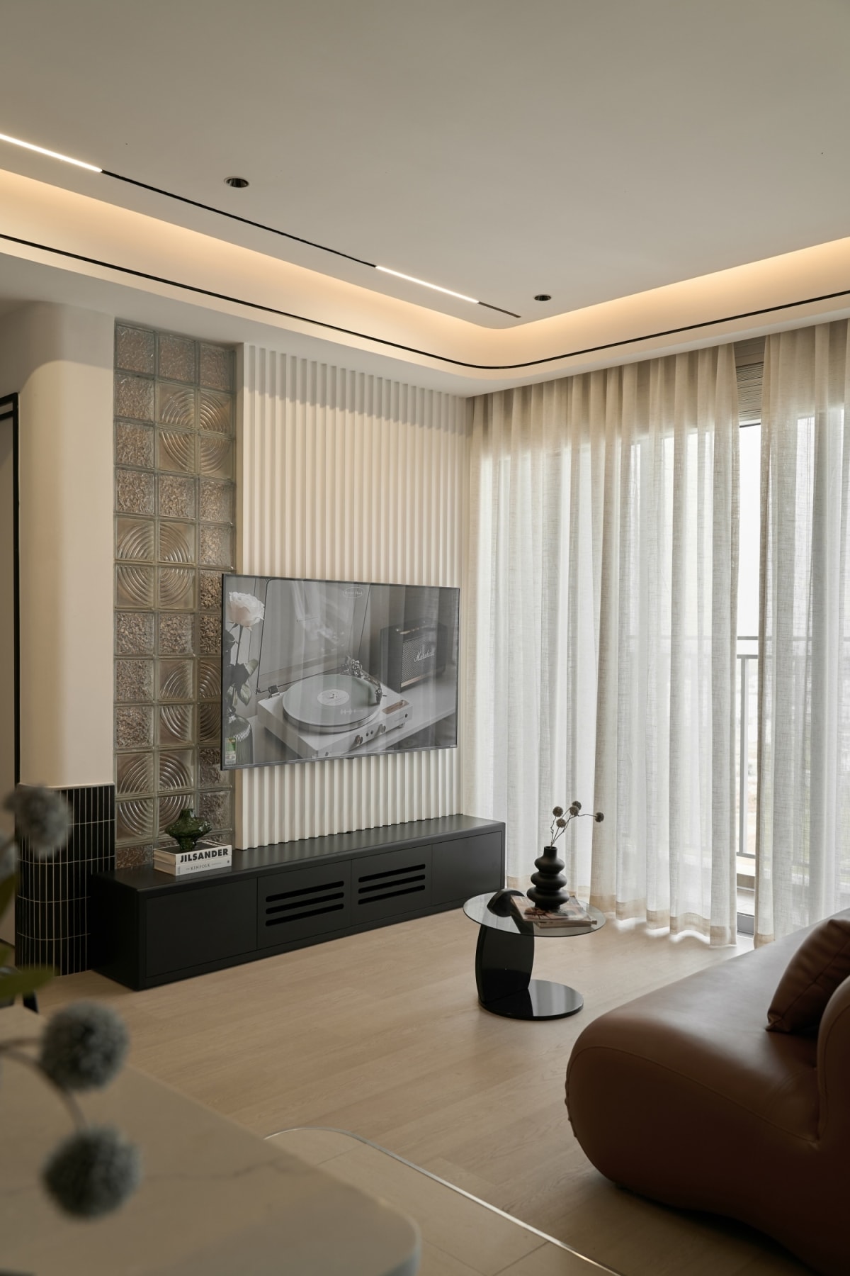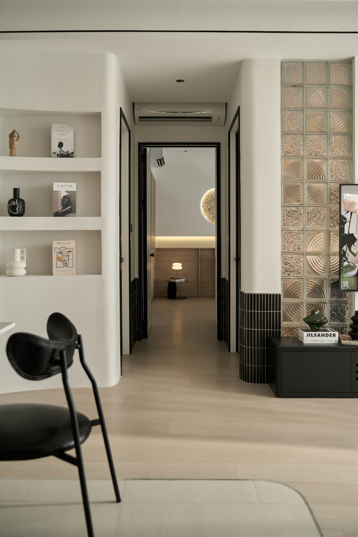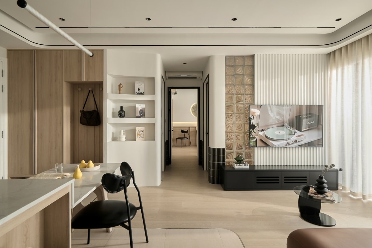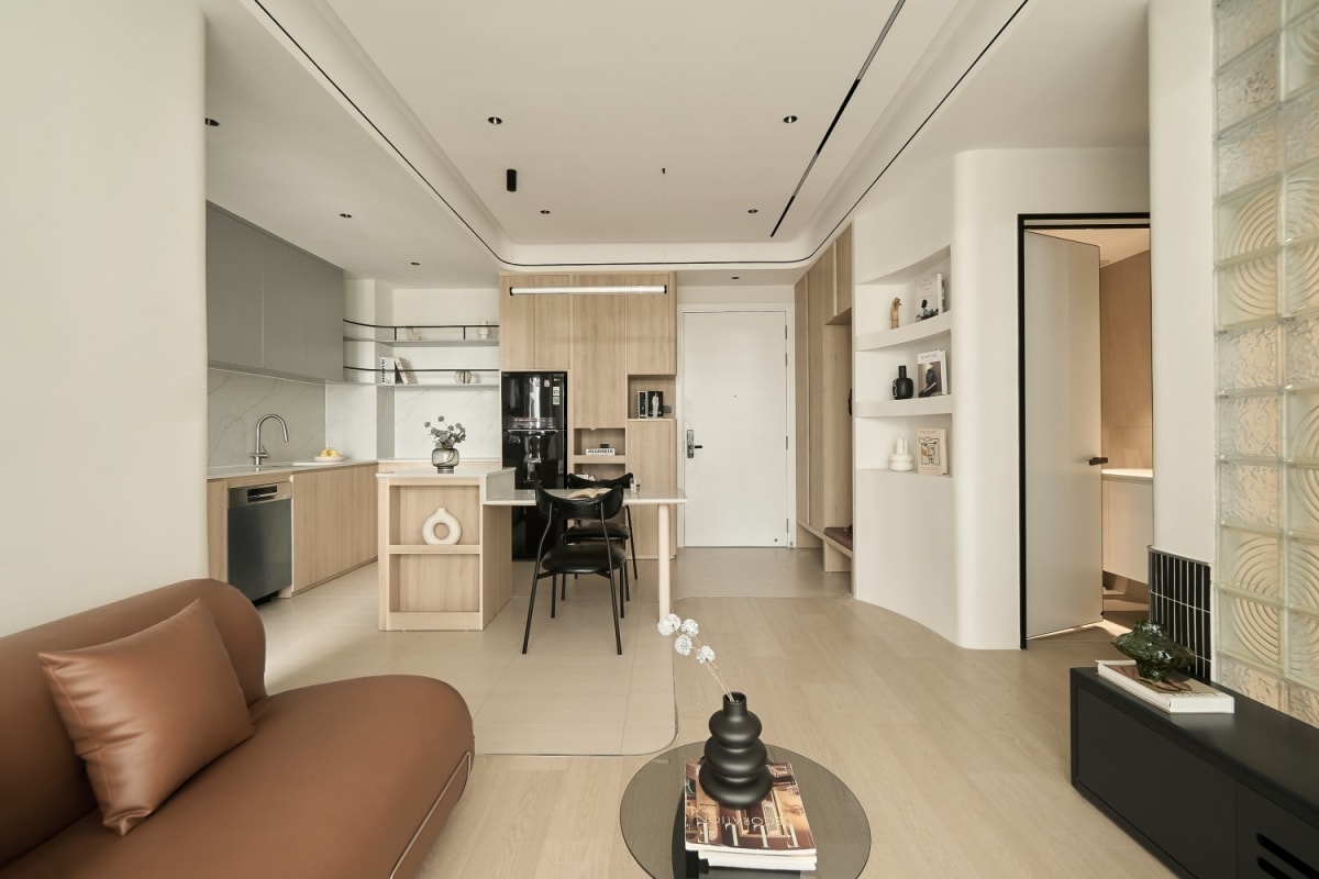Sự kết hợp giữa ánh sáng tự nhiên, đường cong mềm và gam màu trung tính giúp căn hộ trở thành nơi nghỉ ngơi thư giãn sau giờ làm việc.