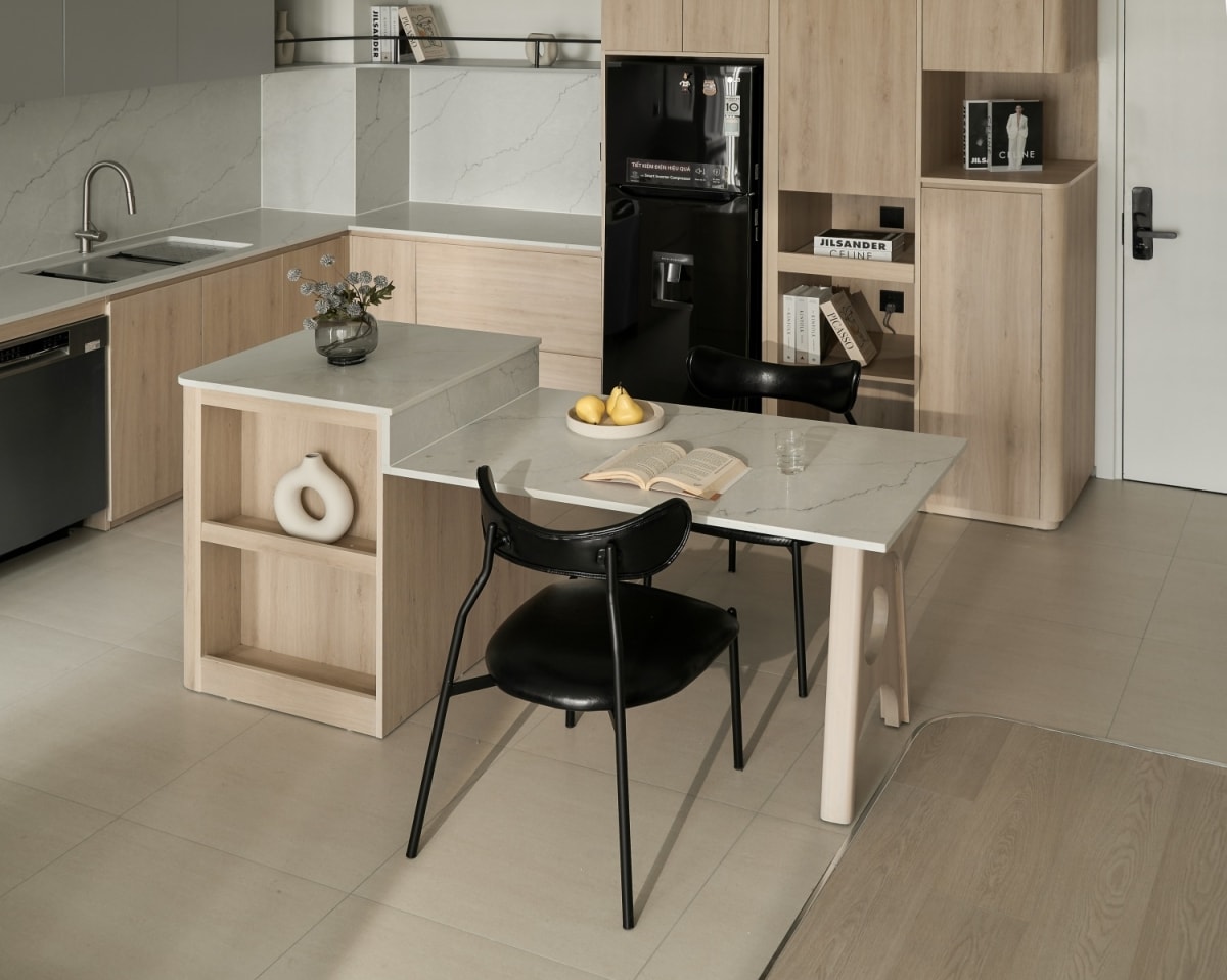 Bếp bố trí sát cửa ra vào, kết hợp đảo bếp và bàn ăn, phân tách khu vực bằng gạch sàn, tạo ranh giới nhẹ giữa bếp và phòng khách.