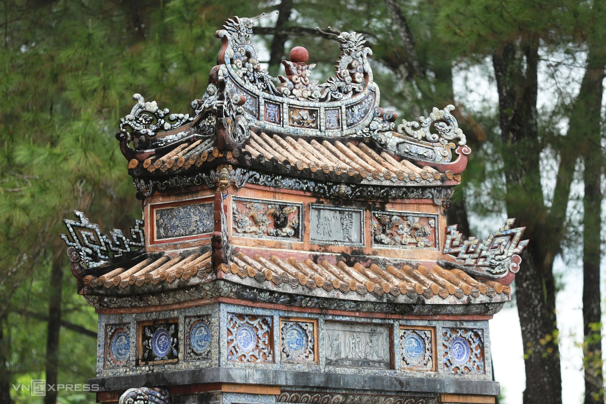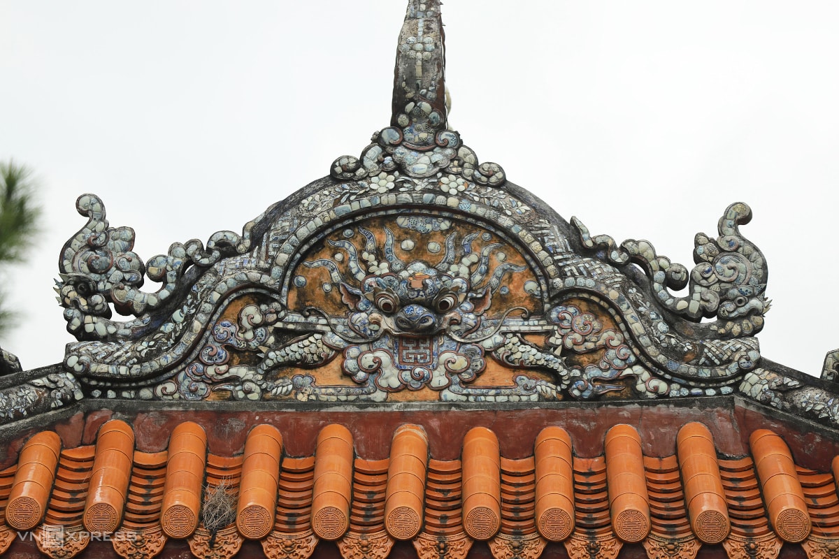 Mái hai bi đình được lợp ngói hoàng lưu ly vàng, chạm khắc hình rồng bằng sành sứ, biểu tượng quyền lực của vương triều Nguyễn.