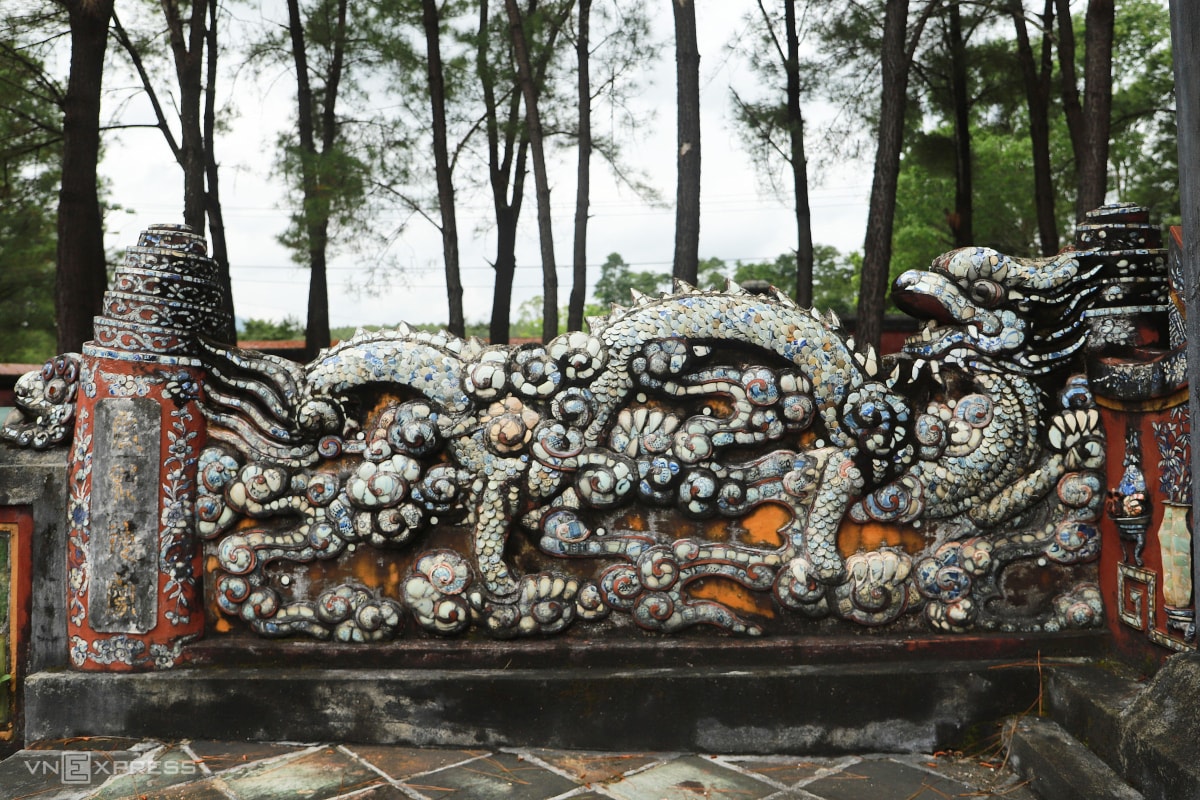 Hai bên lối vào lăng là hai tượng rồng bằng đá Thanh được chạm khắc tinh xảo.