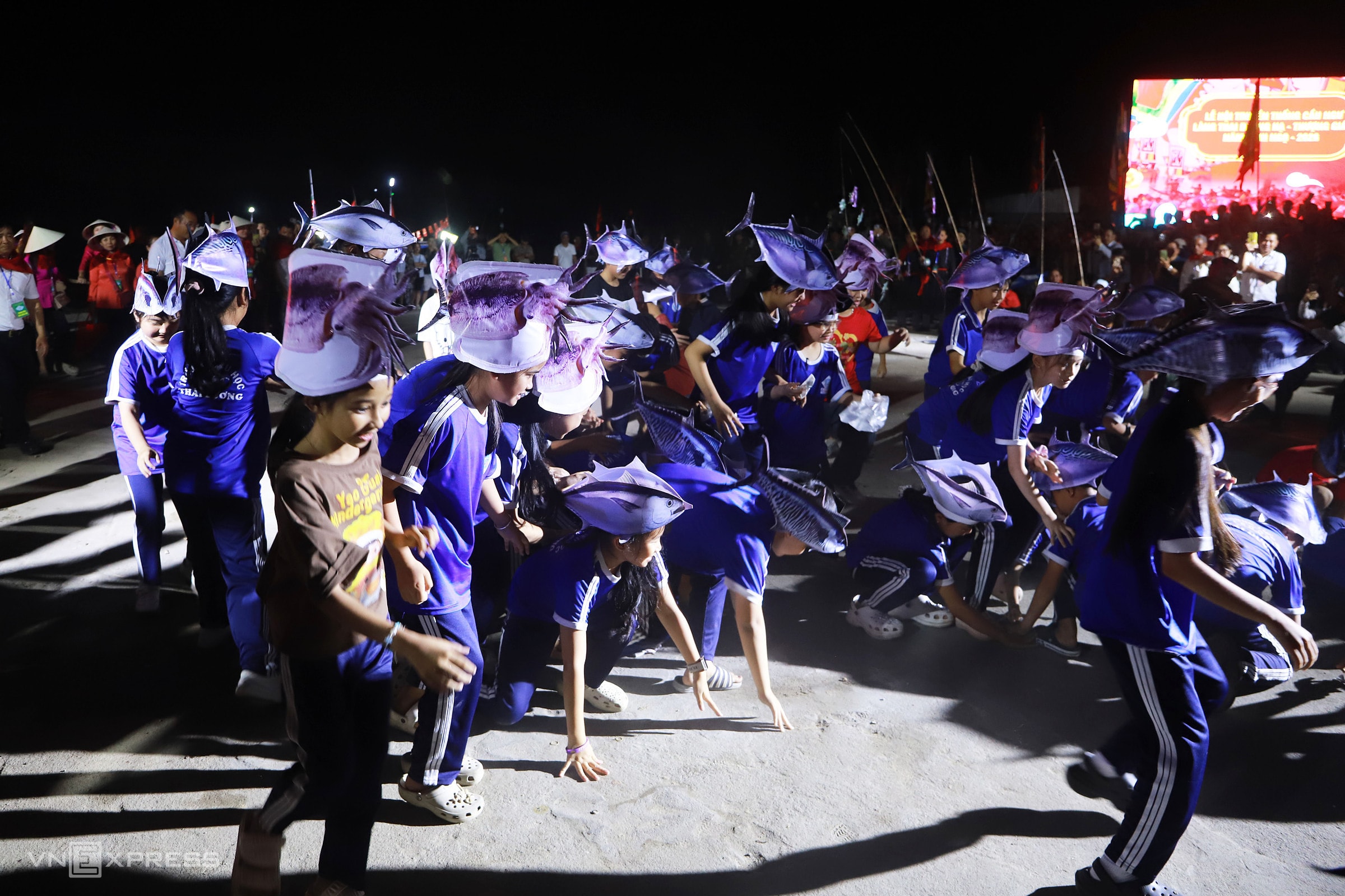 Các em nhỏ trong làng được hóa trang thành những đàn cá đang sinh hoạt trên vùng biển. Ngư dân sẽ thả mồi để thu hút đàn cá trước lúc quăng lưới đánh bắt.