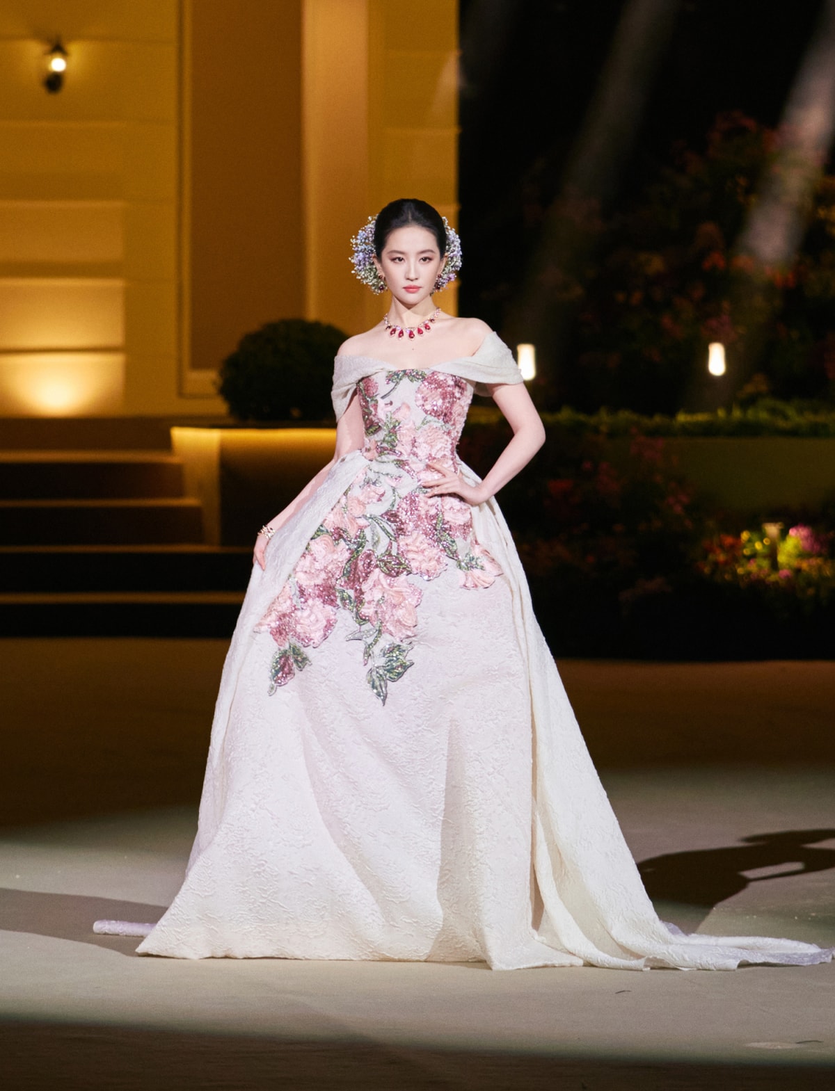 Lưu Diệc Phi tại sự kiện thời trang ở Thượng Hải tối 23/10, kiểu tóc gắn hoa của cô gây sốt mạng xã hội. Video: Vogue