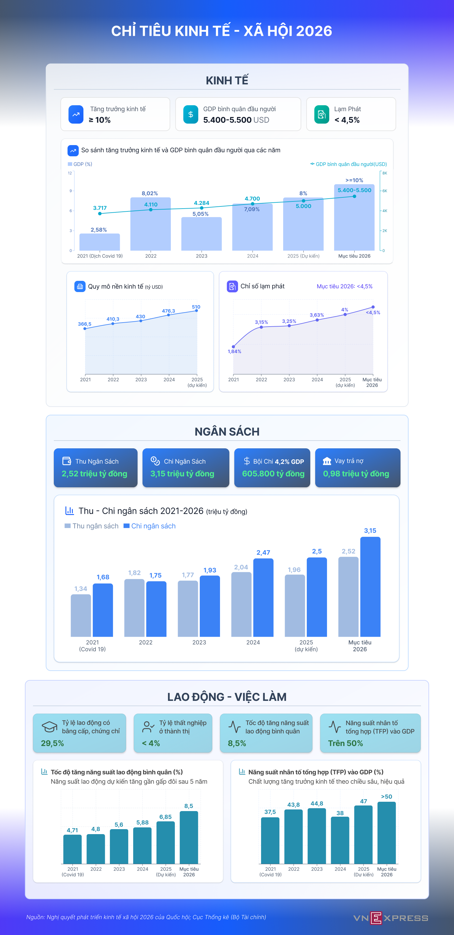Giai đoạn 2021-2025, kinh tế Việt Nam tăng trưởng bình quân 6,3% và lần đầu tiên hướng tới mục tiêu tăng hai con số từ năm 2026.