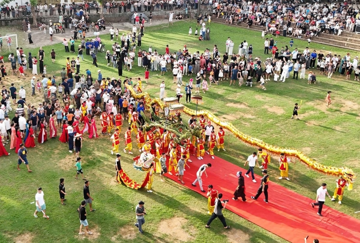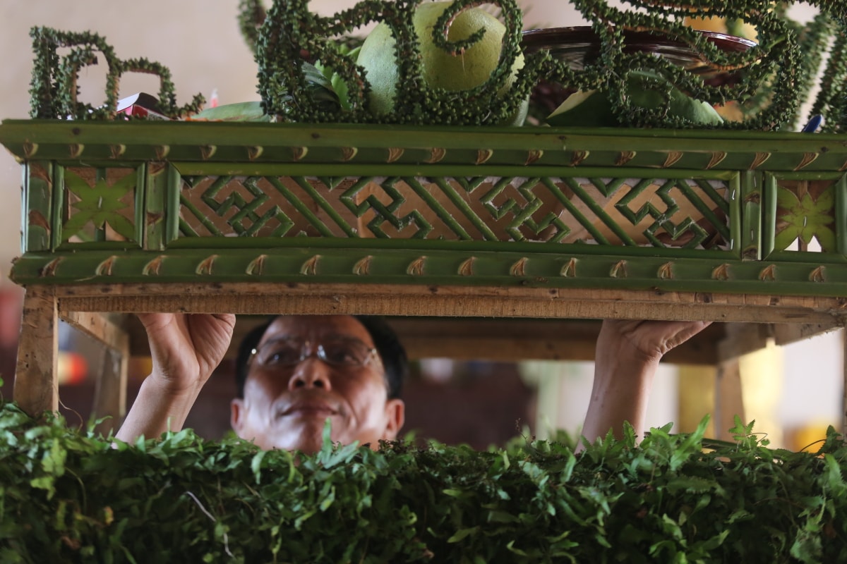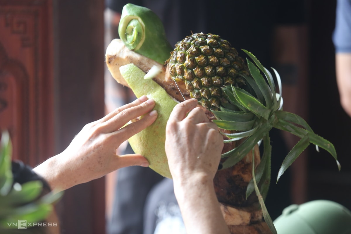Người dân thôn Đồi Hai, xã Phú Nghĩa dùng nhiều loại lá, hoa, quả kết thành kiệu rước, nổi bật là hai chiếc đầu rồng, để giữ gìn nét truyền thống Tết Trung thu vùng ngoại thành.