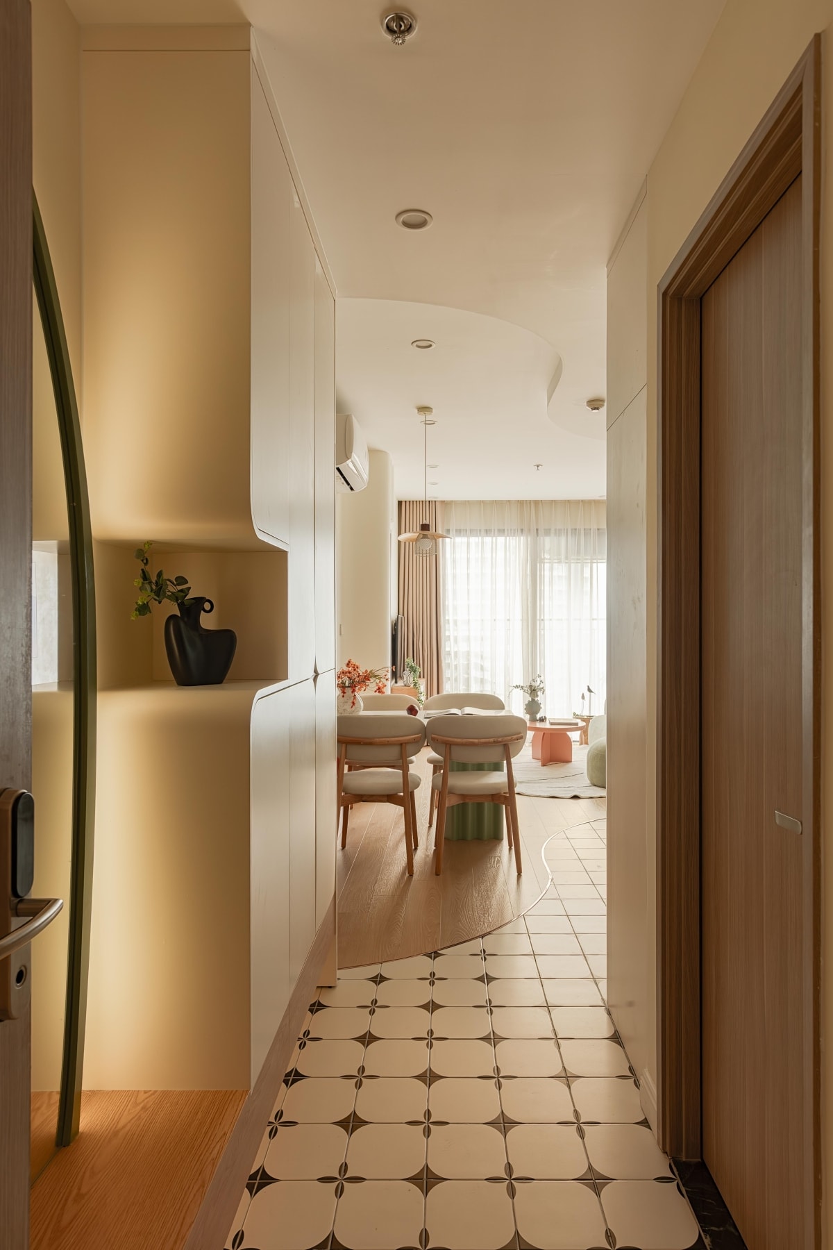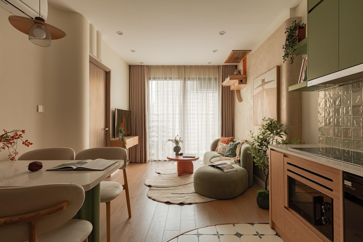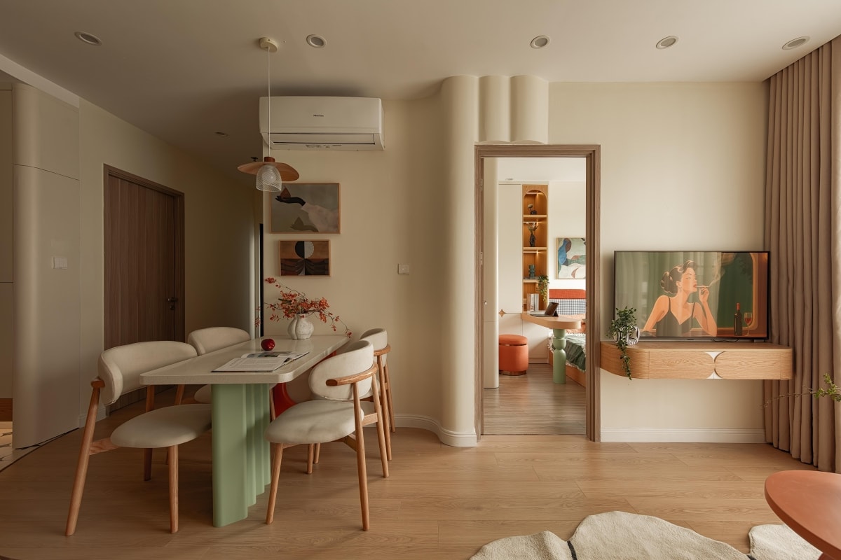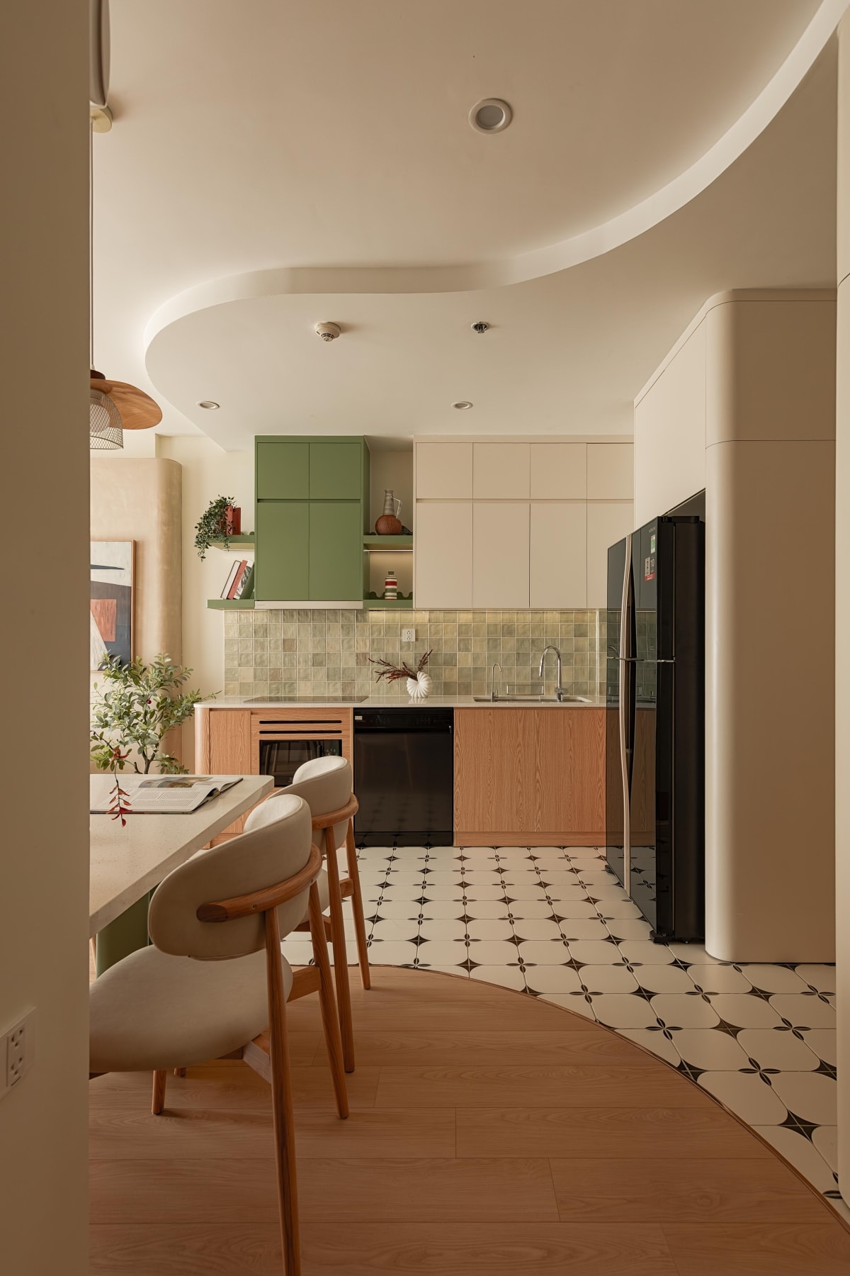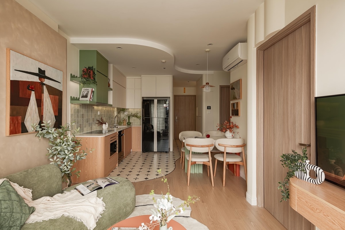 Căn hộ được tổ chức lại theo tinh thần nhẹ nhàng, tiết chế, sử dụng đường cong và ánh sáng để thay đổi cảm nhận không gian.