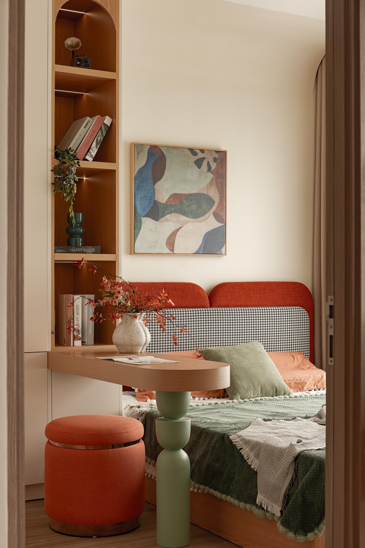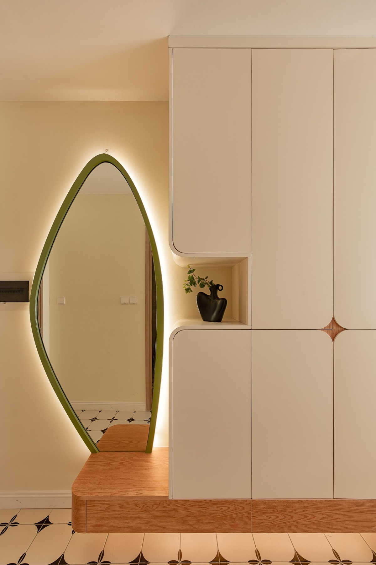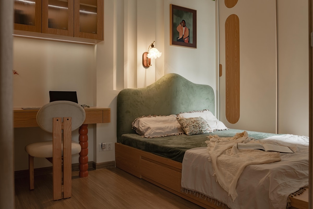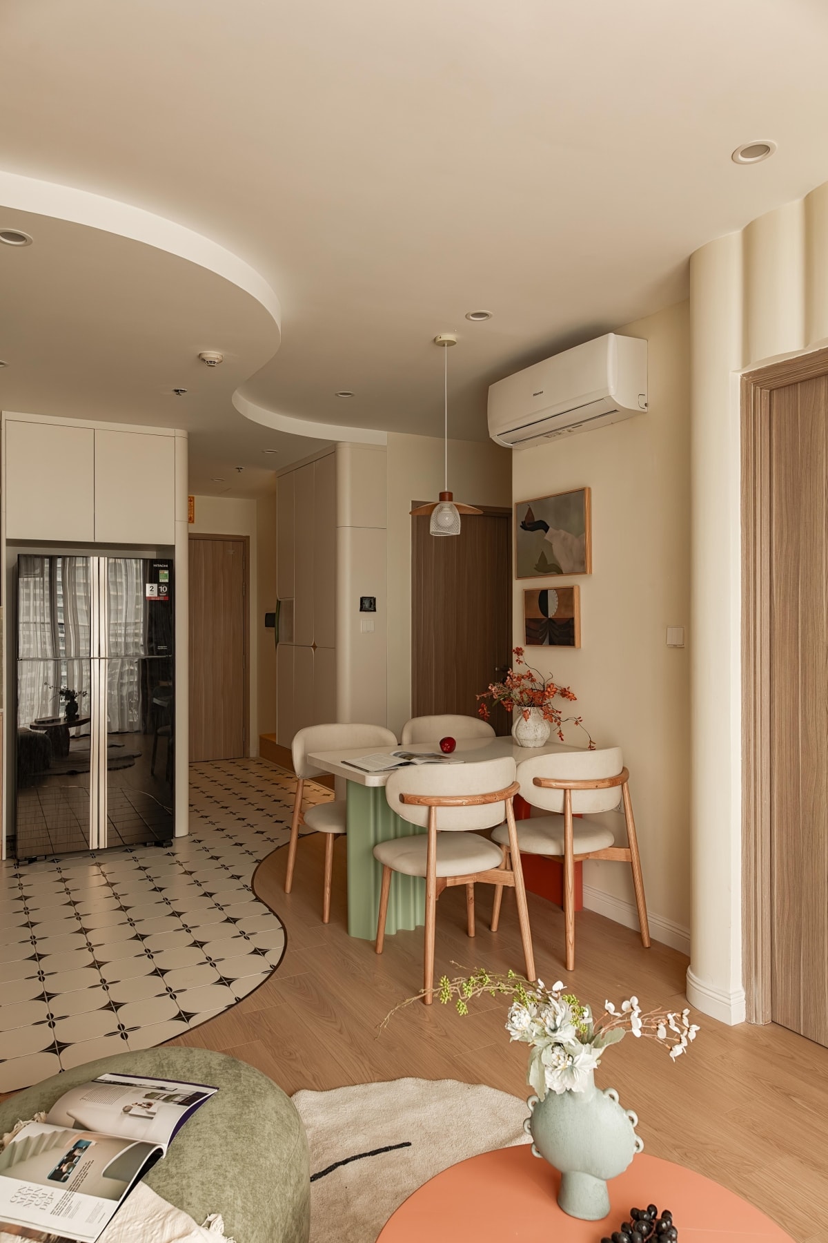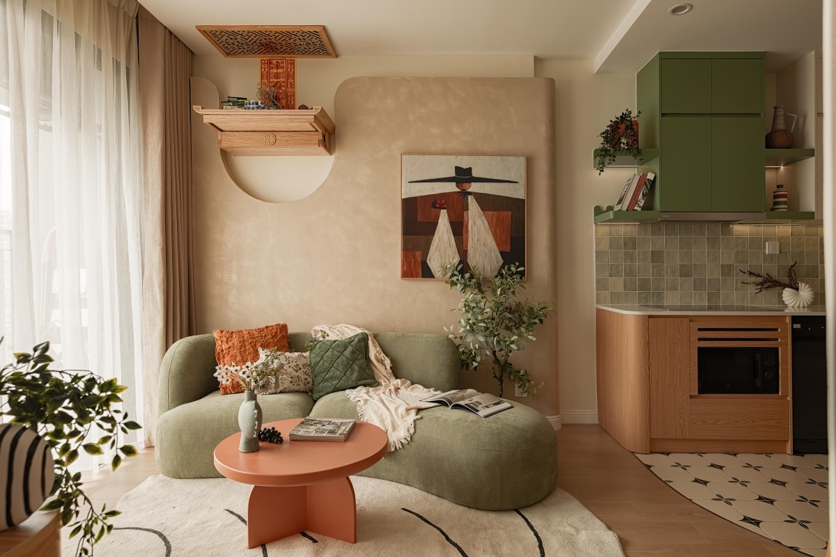 Căn hộ được tổ chức lại theo tinh thần nhẹ nhàng, tiết chế, sử dụng đường cong và ánh sáng để thay đổi cảm nhận không gian.