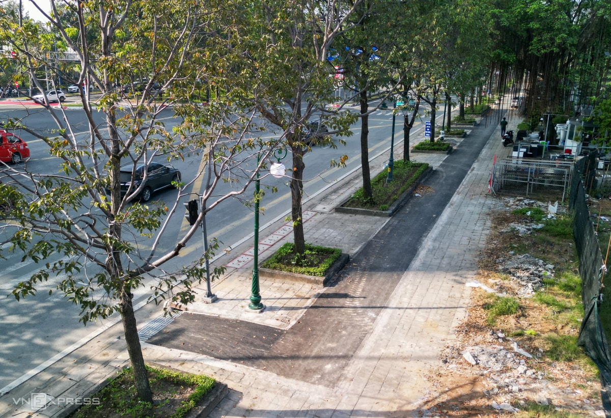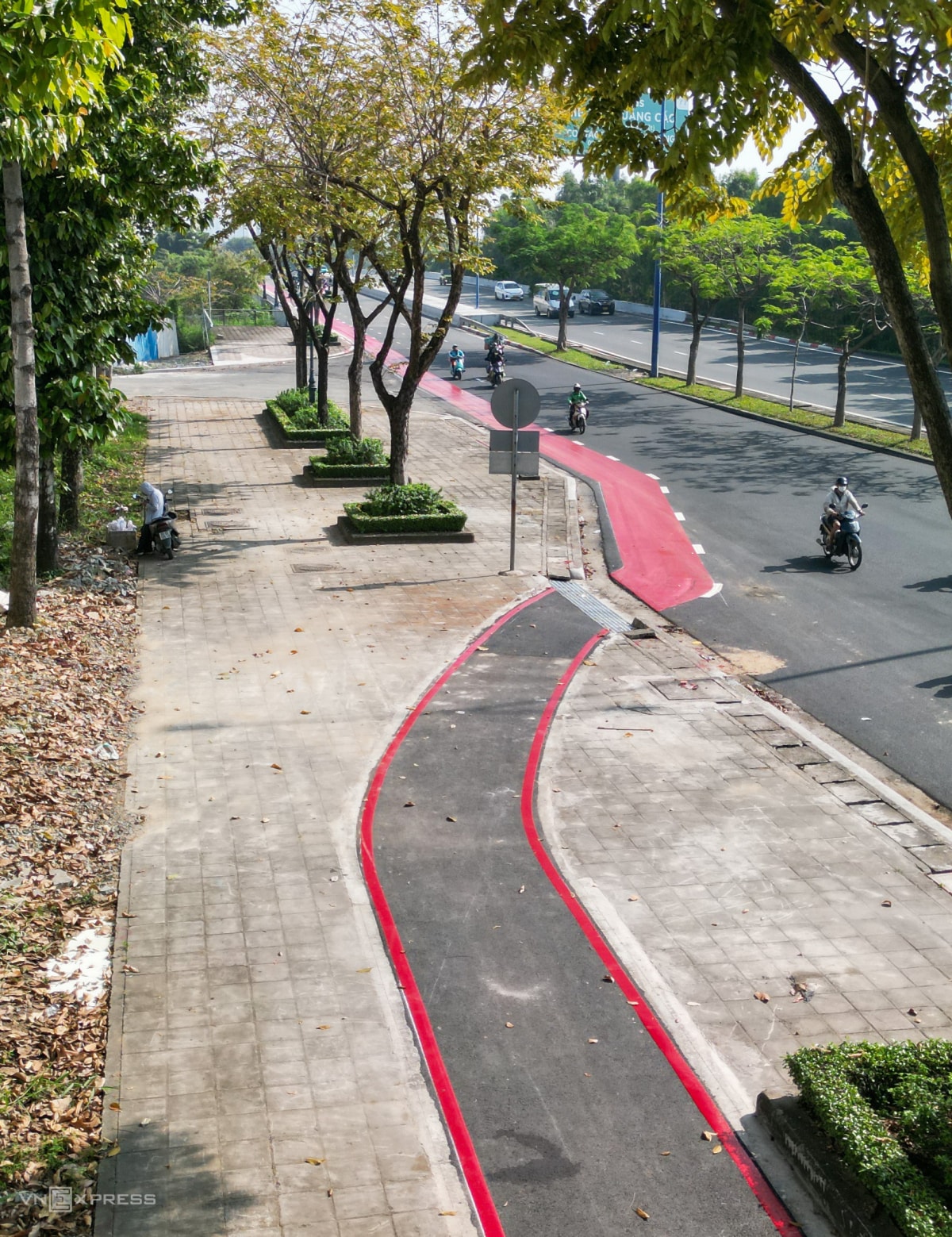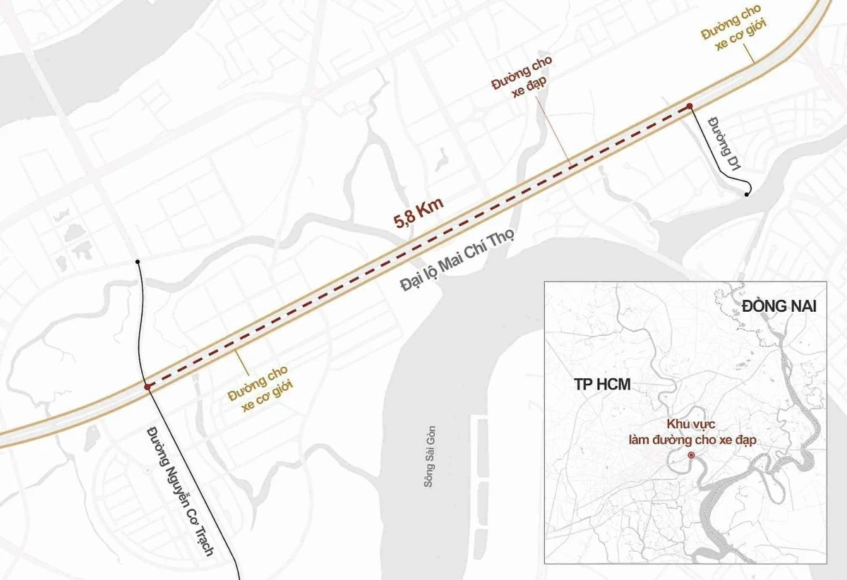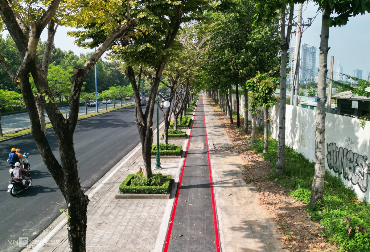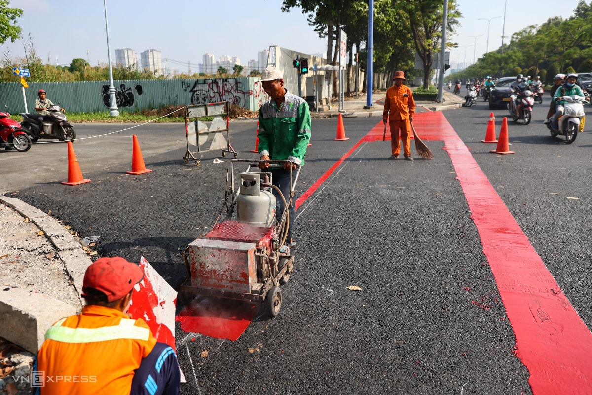 Sau hơn hai tháng thi công, làn đường dài gần 6 km dành riêng cho xe đạp trên đại lộ Mai Chí Thọ đã thành hình, sẽ bàn giao ngày 31/12,