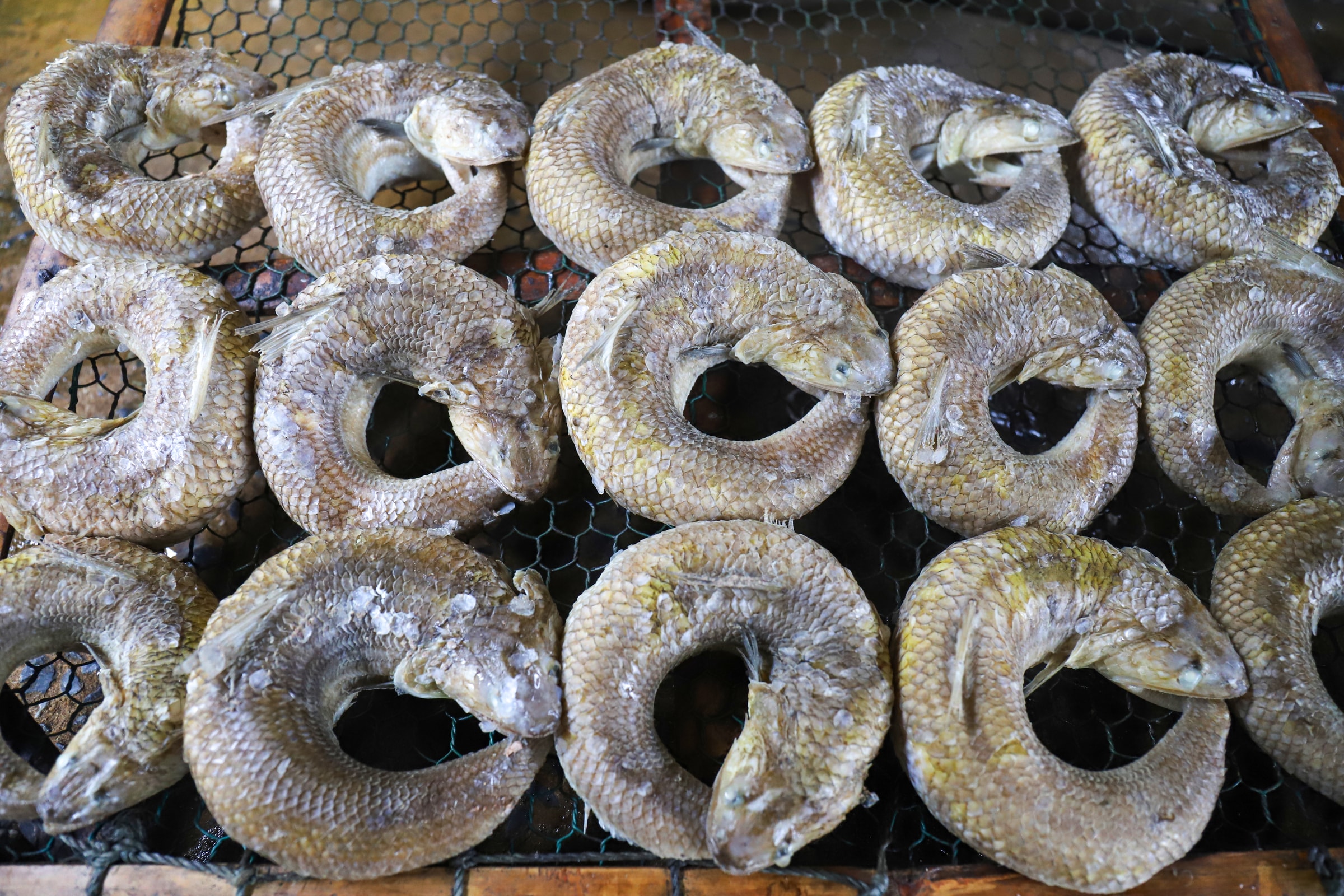 Các mẻ cá sau khi nướng được xếp lên giàn tre, đưa ra sân phơi 30 phút đến một tiếng cho bay hơi trước khi đóng gói.