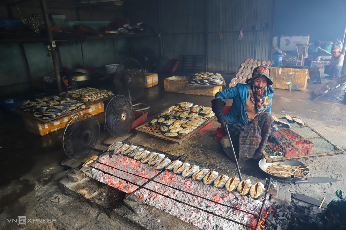 Các cơ sở thường thuê một thợ nướng cá riêng, tiền công khoảng 300.000 đồng mỗi ngày. Các xưởng làm nhỏ lẻ thì gia chủ kiêm luôn công việc này. Cận Tết Bính Ngọ, nhiều hộ tăng ca, thuê thêm 3-4 lao động để kịp đơn hàng.